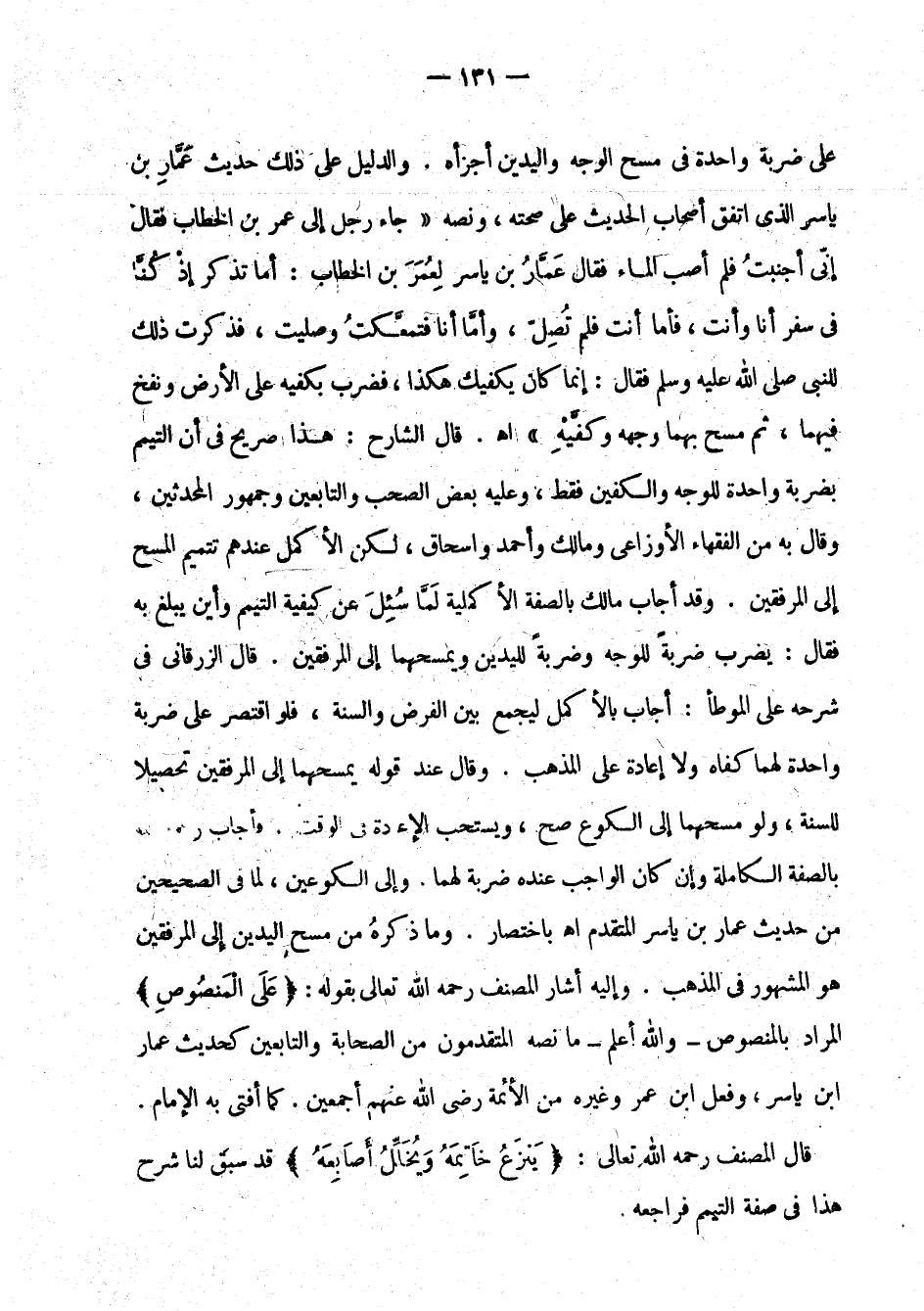 على ضربة واحدة في مسح الوجه واليدين أجزأه. والدليل على ذلك حديث عمار بن ياسر الذي اتفق أصحاب الحديث على صحته، ونصه " جاء رجل إلى عمر بن الخطاب فقال إني أجنبت فلم أصب الماء فقال عمار بن ياسر لعمر بن الخطاب: أما تذكر إذ كنا في سفر أنا وأنت، فأما أنت فلم تصل، وأما أنا فتمعكت وصليت، فذكرت ذلك للنبي صلى الله عليه وسلم فقال: إنما كان يكفيك هكذا، فضرب بكفيه على الأرض ونفخ فيهما، ثم مسح بهما وجهه وكفيه " اهـ. قال الشارح: هذا صريح في أن التيمم بضربة واحدة للوجه والكفين فقط، وعليه بعض الصحب والتابعين وجمهور المحدثين، وقال به من الفقهاء الأوزاعي ومالك وأحمد وإسحاق، لكن الأكمل عندهم تتميم المسح إلى المرفقين. وقد أجاب مالك بالصفة الأكملية لما سئل عن كيفية التيمم وأين يبلغ به فقال: يضرب ضربة للوجه وضربة لليدين ويمسحهما إلى المرفقين. قال الزرقاني في شرحه على الموطأ: أجاب بالأكمل ليجمع بين الفرض والسنة، فلو اقتصر على ضربة واحدة لهما كفاه ولا إعادة على المذهب. وقال عند قوله يمسحهما إلى المرفقين تحصيلا للسنة، ولو مسحهما إلى الكوع صح، ويستحب الإعادة في الوقت. فأجاب رحمه الله بالصفة الكاملة وإن كان الواجب عنده ضربة لهما. وإلى الكوعين، لما في الصحيحين من حديث عمار بن ياسر المتقدم اهـ باختصار. وما ذكره من مسح اليدين إلى المرفقين هو المشهور في المذهب. وإليه أشار المصنف رحمه الله تعالى بقوله: " على المنصوص " المراد بالمنصوص - والله أعلم - ما نصه المتقدمون من الصحابة والتابعين كحديث عمار بن ياسر، وفعل ابن عمر وغيره من الأئمة رضي الله عنهم أجمعين. كما أفتى به الإمام.
