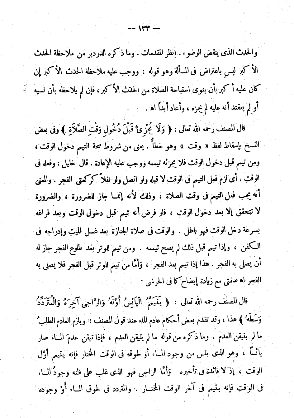 قال المصنف رحمه الله تعالى: " ولا يجزئ قبل دخول وقت الصلاة " وفي بعض النسخ بإسقاطه لفظ " وقت " وهو خطأ. يعني من شروط صحة التيمم دخول الوقت، ومن تيمم قبل دخول الوقت فلا يجزئه تيممه ووجب عليه الإعادة. قال خليل: وفعله في الوقت. أي لزم فعل التيمم في الوقت لا قبله ولو اتصل ولو نفلا كركعتي الفجر. والمعنى أنه يجب فعل التيمم في وقت الصلاة، وذلك لأنه إنما جاز للضرورة، والضرورة لا تتحقق إلا بعد دخول الوقت، فلو فرض أنه تيمم قبل دخول الوقت وبعد فراغه بسرعة دخل الوقت فهو باطل. والوقت في صلاة الجنازة بعد غسل الميت وإدراجه في الكفن، وإذا تيمم قبل ذلك لم يصح تيممه. ومن تيمم للوتر بعد طلوع الفجر جاز له أن يصلي به الفجر. هذا إذا تيمم بعد الفجر، وأما من تيمم للوتر قبل الفجر فلا يصلي به الفجر اهـ الصفتي مع زيادة إيضاح كما