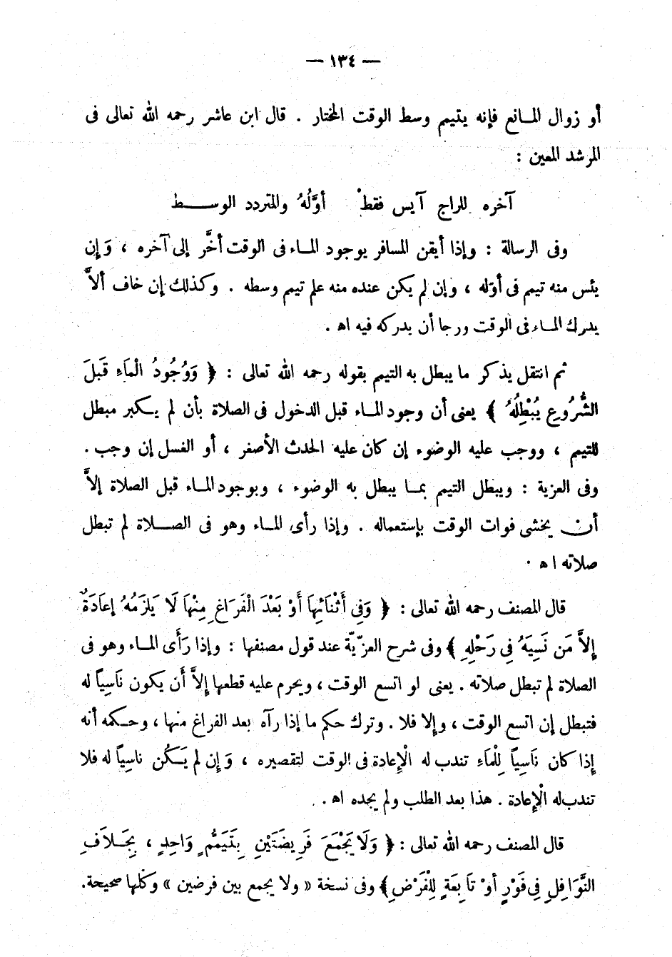 قال المصنف رحمه الله تعالى: " وفي أثنائها أو بعد الفراغ منها لا يلزمه إعادة إلا من نسيه في رحله " وفي شرح العزية عند قول مصنفها: وإذا رأى الماء وهو في الصلاة لم تبطل صلاته. يعني لو اتسع الوقت، ويحرم عليه قطعها إلا أن يكون ناسيا له فتبطل إن اتسع الوقت، وإلا فلا. وترك حكم ما إذا رآه بعد الفراغ منها، وحكمه أنه إذا كان ناسيا للماء تندب له الإعادة في الوقت لتقصيره، وإن لم يكن ناسيا له فلا تندب له الإعادة. هذا بعد الطلب ولم يجده اهـ.