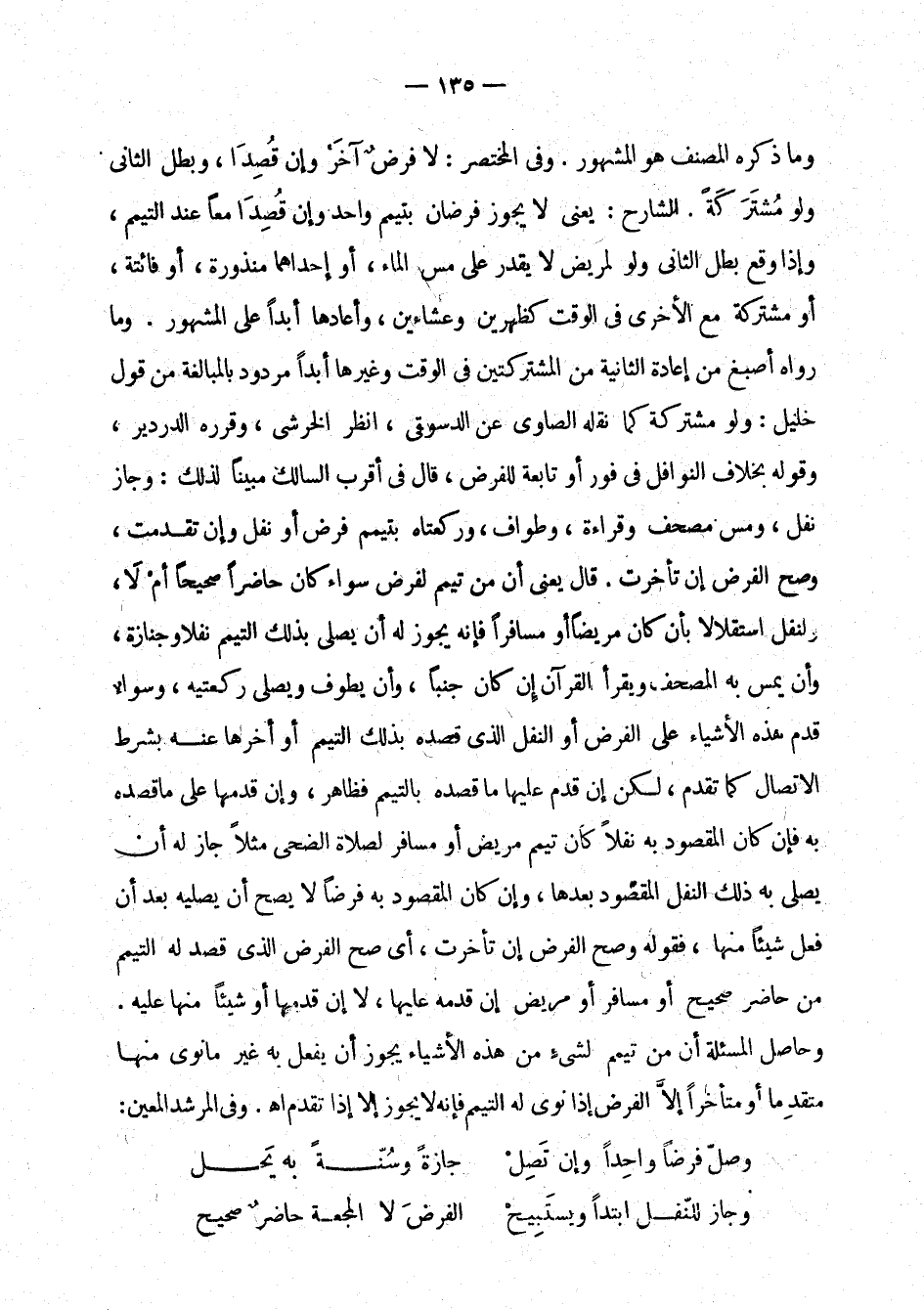 المشتركتين في الوقت وغيرها أبدا مردود بالمبالغة من قول خليل: ولو مشتركة كما نقله الصاوي عن الدسوقي، انظر الخرشي، وقرره الدردير، وقوله بخلاف النوافل في فور أو تابعة للفرض، قال في أقرب المسالك مبينا لذلك: وجاز نفل، ومس مصحف وقراءة، وطواف، وركعتاه بتيمم فرض أو نفل وإن تقدمت، وصح الفرض إن تأخرت. قال يعني أن من تيمم لفرض سواء كان حاضرا صحيحا أم لا، ولنفل استقلالا بأن كان مريضا أو مسافرا فإنه يجوز له أن يصلي بذلك التيمم نفلا وجنازة، وأن يمس به المصحف ويقرأ القرآن إن كان جنبا، وأن يطوف ويصلي ركعتين، وسواء قدم هذه الأشياء على الفرض أو النفل الذي قصده بالتيمم فظاهر، وإن قدمها على ما قصده به فإن كان المقصود به نفلا كان تيمم مريض أو مسافر لصلاة الضحى مثلا جاز له أن يصلي به ذلك النفل المقصود بعدها، وإن كان المقصود به فرضا لا يصح أن يصليه بعد أن فعل شيئا منها، فقوله وصح الفرض إن تأخرت، أي صح الفرض الذي قصد له التيمم من حاضر صحيح أو مسافر أو مريض إن قدمه عليها، لا إن قدمها أو شيئا منها عليه. وحاصل المسألة أن من تيمم لشيء من هذه الأشياء يجوز أن يفعل به غير ما نوى منها متقدما أو متأخرا إلا الفرض إذا نوى له التيمم فإنه لا يجوز إلا إذا تقدم اهـ. وفي المرشد المعين: