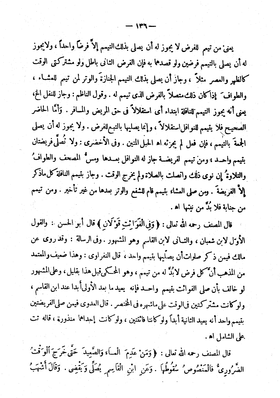 والقول الأول لابن شعبان، والثاني لابن القاسم وهو المشهور. وفي الرسالة: وقد روي عن مالك فيمن ذكر صلوات أن يصليها بتيمم واحد، قال النفراوي: وهذا ضعيف والمعتمد من المذهب أن كل فرض لا بد له من تيمم، وهو المحكي قبل هذا بقليل، وعلى المشهور لو خالف بأن صلى الفوائت بتيمم واحد فإنه يعيد ما بعد الأولى أبدا عنه ابن القاسم، ولو كانت مشتركتين في الوقت على ما شهره في المختصر. قال العدوي فيمن صلى الفريضتين بتيمم واحد أنه يعيد الثانية أبدا ولو كانتا فائتتين، ولو كانت إحداهما منذورة، قاله تت على الشامل اهـ.