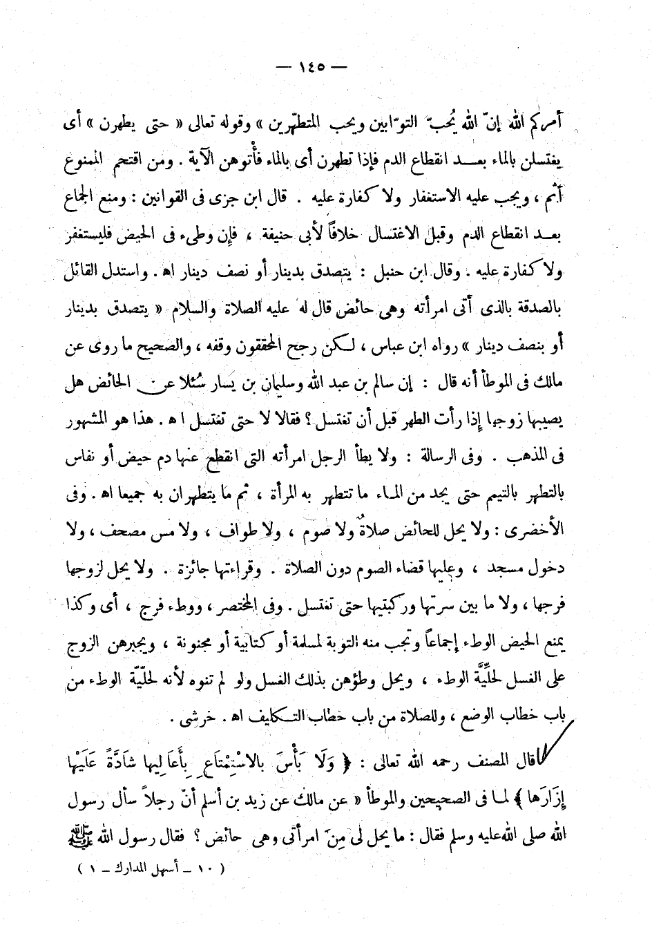 أَمَرَكُمُ اللهُ إِنَّ اللهَ يُحِبُّ التَّوَّابِينَ وَيُحِبُّ الْمُتَطَهِّرِينَ} [البقرة: 222] وقوله تعالى: {حَتَّىَ يَطْهُرْنَ} أي يغتسلن بالماء بعد انقطاع الدم فإذا تطهرن أي بالماء فأتوهن الآية. ومن اقتحم الممنوع أثم، ويجب عليه الاستغفار ولا كفارة عليه. قال ابن جزي في القوانين: ومنع الجماع بعد انقطاع الدم وقبل الاغتسال خلافا لأبي حنيفة، فإن وطئ في الحيض فليستغفر ولا كفارة عليه. وقال ابن حنبل: يتصدق بدينار أو نصف دينار اهـ. واستدل القائل بالصدقة بالذي أتى امرأته وهي حائض قال له عليه الصلاة والسلام: " يتصدق بدينار أو بنصف دينار " رواه ابن عباس، ولكن رجح المحققون وقفه، والصحيح ما روي عن مالك في الموطأ، أنه قال: إن سالم بن عبد الله وسليمان بن يسار سئلا عن الحائض هل يصيبها زوجها إذا رأت الطهر قبل أن تغتسل؟ فقالا لا حتى تغتسل اهـ. هذا هو المشهور في المذهب. وفي الرسالة: ولا يطأ الرجل امرأته التي انقطع عنها دم حيض أو نفاس بالتطهر بالتيمم حتى يجد من الماء ما تتطهر به المرأة، ثم ما يتطهران به جميعا اهـ. وفي الأخضري: ولا يحل للحائض صلاة ولا صوم، ولا طواف، ولا مس مصحف، ولا دخول مسجد، وعليها قضاء الصوم دون الصلاة. وقراءتها جائزة. ولا يحل لزوجها فرجها، ولا ما بين سرتها وركبتيها حتى تغتسل. وفي المختصر: ووطء فرج، أي وكذا يمنع الحيض الوطء إجماعا وتجب منه التوبة لمسلمة أو كتابية أو مجنونة، ويجبرهن الزوج على الغسل لحلية الوطء، ويحل وطؤهن بذلك الغسل ولو لم تنوه لأنه لحلية الوطء من باب خطاب الوضع، وللصلاة من باب خطاب التكليف اهـ. الخرشي.