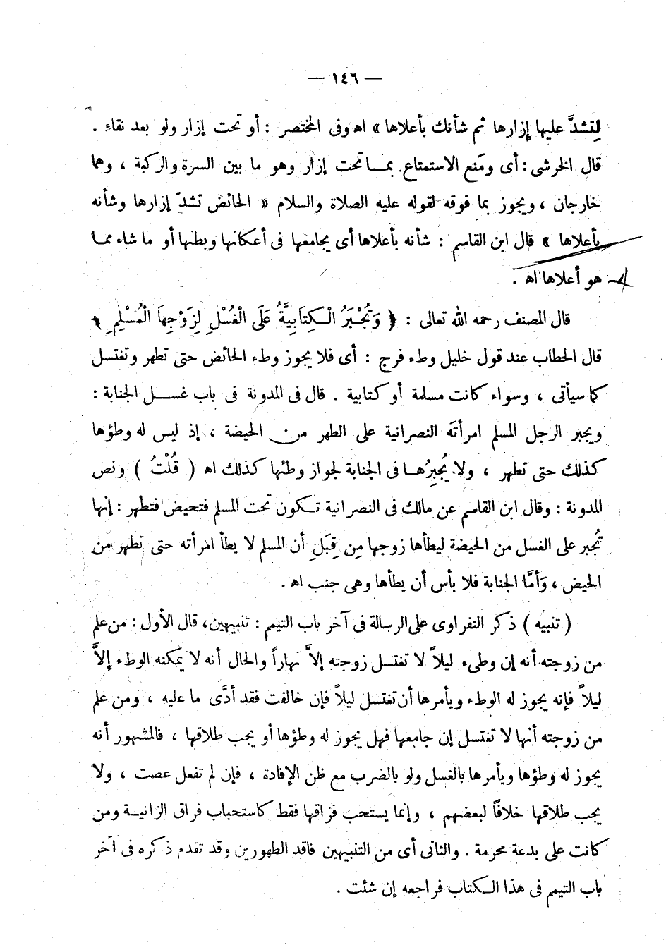 قال المصنف رحمه الله تعالى: " وتجبر الكتابية على الغسل لزوجها المسلم " قال الحطاب عند قول خليل وطء فرج " أي فلا يجوز وطء الحائض حتى تطهر وتغتسل كما سيأتي، وسواء كانت مسلمة أو كتابية. قال في المدونة في باب غسل الجنابة: ويجبر الرجل المسلم امرأته النصرانية على الطهر من الحيضة، إذ ليس له وطؤها كذلك حتى تطهر، ولا يجبرها في الجنابة لجواز وطئها كذلك اهـ قلت: ونص المدونة: وقال ابن القاسم عن مالك في النصرانية تكون تحت المسلم فتحيض فتطهر: إنها تجبر على الغسل من الحيضة ليطأها زوجها من قبل أن المسلم لا يطأ امرأته الحائض حتى تطهر من الحيض، وأما الجنابة فلا بأس أن يطأها وهي جنب اهـ.
