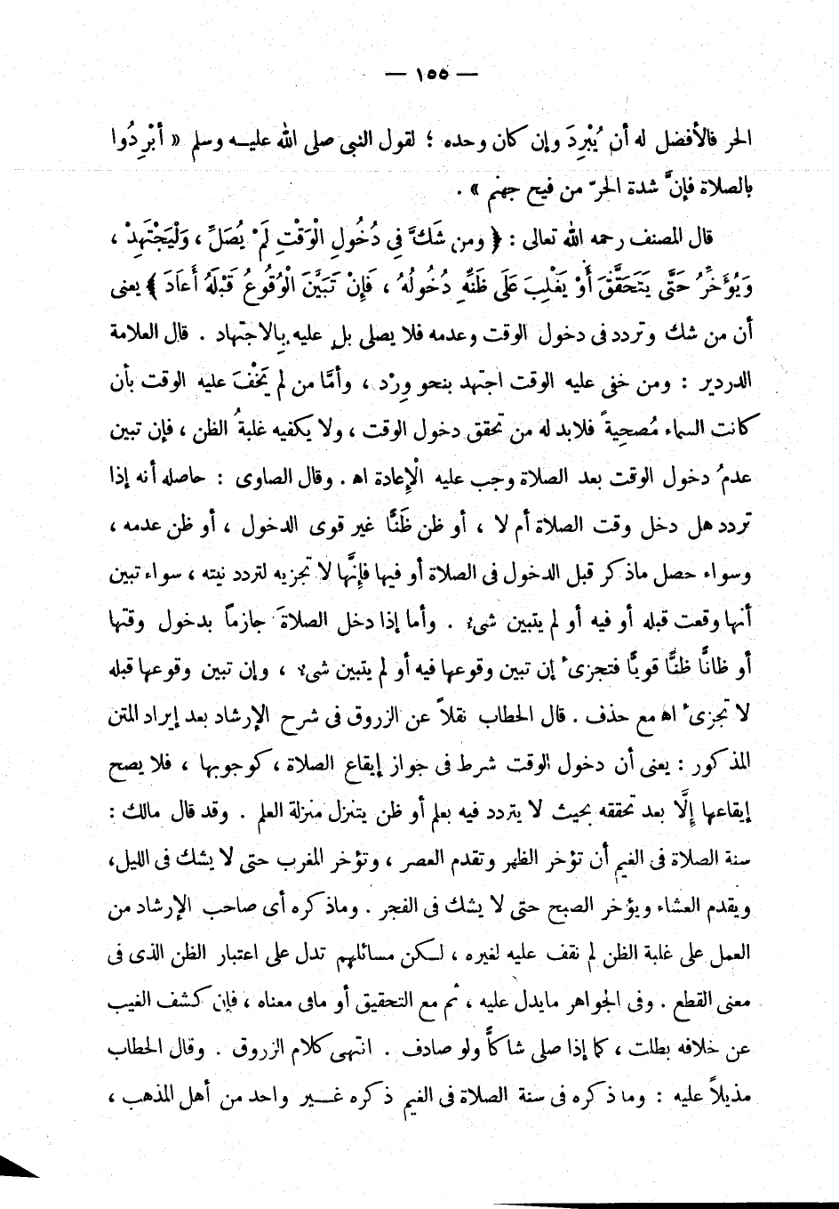 قال المصنف رحمه الله تعالى: " ومن شك في دخول الوقت لم يصل، وليجتهد، ويؤخر حتى يتحقق أو يغلب على ظنه دخوله، فإن تبين الوقوع قبله أعاد " يعني أن من شك وتردد في دخول الوقت وعدمه فلا يصلي بل عليه بالاجتهاد. قال العلامة الدردير: ومن خفي عليه الوقت اجتهد بنحو ورد، وأما من لم يخف عليه الوقت بأن كانت السماء مصحية فلا بد له من تحقق دخول الوقت، ولا يكفيه غلبة الظن، فإن تبين عدم دخول الوقت بعد الصلاة وجب عليه الإعادة اهـ. وقال الصاوي: حاصله أنه إذا تردد هل دخل وقت الصلاة أم لا، أو ظن ظنا غير قوي الدخول، أو ظن عدمه، وسواء حصل ما ذكر قبل الدخول في الصلاة أو فيها فإنها لا تجزيه لتردد نيته، سواء تبين أنها وقعت قبله أو فيه أولم يتبين وقوعها فيه أو لم يتبين شيء، وإن تبين وقوعها قبله لا تجزئ اهـ مع حذف اهـ مع حذف. قال الحطاب نقلا عن الزروق في شرح الإرشاد بعد إيراد المتن المذكور: يعني أن دخول الوقت شرط في جواز إيقاع الصلاة، كوجوبها، فلا يصح إيقاعها إلا تحققه بحيث لا يتردد فيه بعلم أو ظن يتنزل منزلة العلم. وقد قال مالك: سنة الصلاة في الغيم أن تؤخر الظهر وتقدم العصر، وتؤخر المغرب حتى لا يشك في الليل، ويقدم العشاء ويؤخر الصبح حتى لا يشك في الفجر. وما ذكره أي صاحب الإرشاد من العمل على غلبة الظن لم نقف عليه لغيره، لكن مسائلهم تدل على اعتبار الظن الذي في معنى القطع. وفي الجواهر ما يدل عليه، ثم مع التحقيق أو ما في معناه، فإن كشف الغيب عن خلافه بطلت، كما إذا صلى شاكا ولو صادف. انتهى كلام الزروق. وقال الحطاب مذيلا عليه: وما ذكره في سنة الصلاة في الغيم ذكره غير واحد من أهل المذهب،
