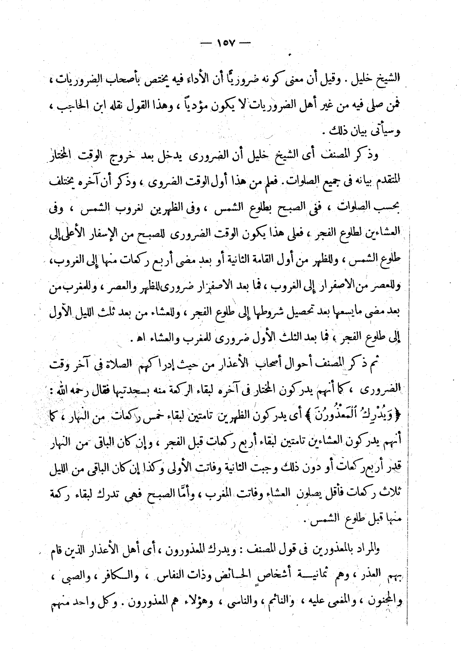 الشيخ خليل. وقيل إن معنى كونه ضروريا أن الأداء فيه يختص بأصحاب الضروريات، فمن صلى فيه من غير أهل الضروريات لا يكون مؤديا، وهذا القول نقله ابن الحاجب، وسيأتي بيان ذلك.