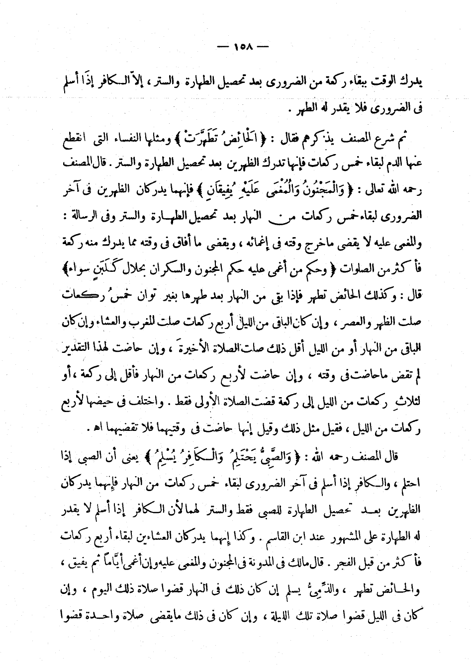 ثم شرع المصنف يذكرهم فقال: " الحائض تطهرت " ومثلها النفساء التي انقطع عنها الدم لبقاء خمس ركعات فإنها تدرك الظهرين بعد تحصيل الطهارة والستر. قال المصنف رحمه الله تعالى: " والمجنون والمغمى عليه يفيقان " فإنهما يدركان الظهرين في آخر الضروري لبقاء خمس ركعات من النهار بعد تحصيل الطهارة والستر، وفي الرسالة: والمغمى عليه لا يقضي ما خرج وقته في إغمائه، ويقضي ما أفاق في وقته مما يدرك منه ركعة فأكثر من الصلوات " وحكم من أغمي عليه حكم المجنون والسكران بحلال كلبن سواء " قال: وكذلك الحائض تطهر فإذا بقي من النهار بعد طهرها بغير توان خمس ركعات صلت الظهر والعصر، وإن كان الباقي من الليل أربع ركعات صلت المغرب والعشاء وإن كان الباقي من النهار أو من الليل أقل من ذلك صلت الصلاة الأخيرة، وإن حاضت لهذا التقدير لم تقض ما حاضت في وقته، وإن حاضت لأربع ركعات من النهار فأقل إلى ركعة، أو لثلاث ركعات من الليل، فقيل إنها حاضت في وقتيها فلا تقضيهما اهـ.
