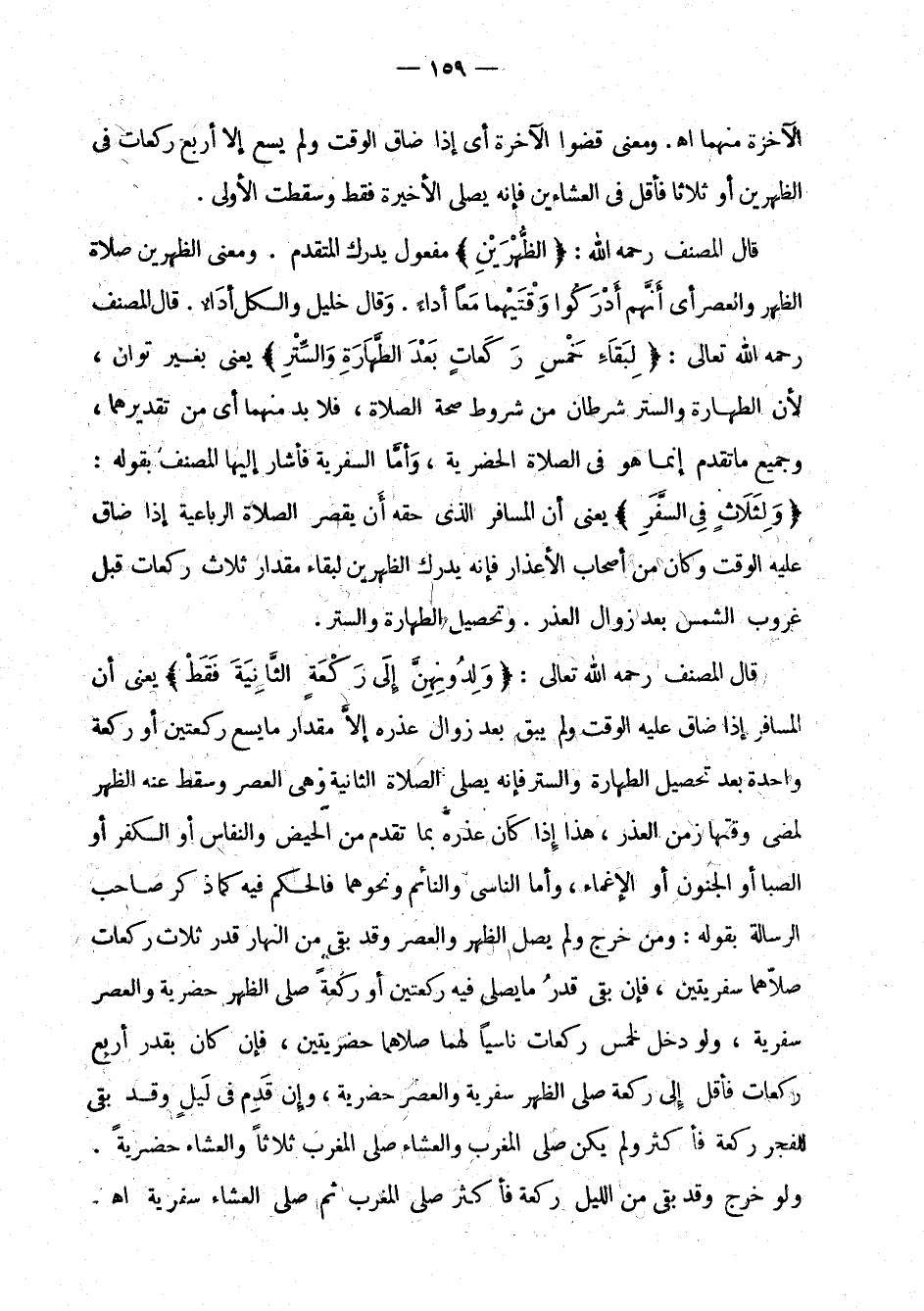 قال المصنف رحمه الله: " الظهرين " مفعول يدرك المتقدم. ومعنى الظهرين صلاة الظهر والعصر أي إنهم أدركوا وقتيهما معا أداء. وقال خليل والكل أداء. قال المصنف رحمه الله تعالى: " لبقاء خمس ركعات بعد الطهارة والستر " يعني بغير توان، لأن الطهارة والستر شرطان من شروط صحة الصلاة، فلا بد منهما أي من تقديرهما، وجميع ما تقدم إنما هو في الصلاة الحضرية، وأما السفرية فأشار إليها المصنف بقوله: " ولثلاث في السفر " يعني أن المسافر الذي حقه أن يقصر الصلاة الرباعية إذا ضاق عليه الوقت وكان من أصحاب الأعذار فإنه يدرك الظهرين لبقاء مقار ثلاث ركعات قبل غروب غروب الشمس بعد زوال العذر. وتحصيل الطهارة والستر.