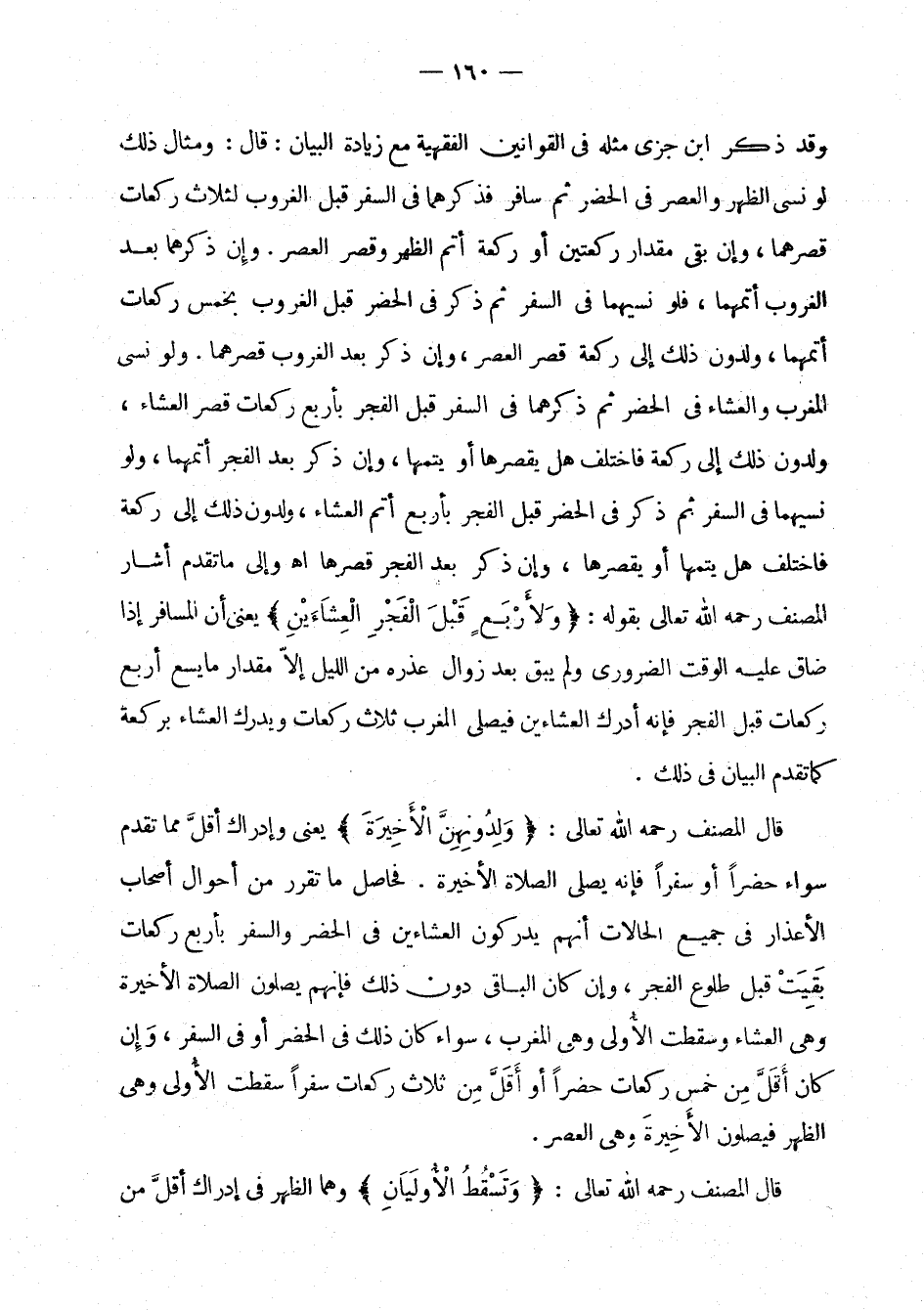 وقد ذكر ابن جزي مثله في القوانين الفقهية مع زيادة البيان: قال: ومثال ذلك لو نسي الظهر والعصر في الحضر ثم سافر فذكرهما في السفر قبل الغروب لثلاث ركعات قصرهما، وإن بقي مقدار ركعتين أو ركعة أتم الظهر وقصر العصر. وإن ذكرهما بعد الغروب أتمهما، فلو نسيهما في السفر ثم ذكر في الحضر قبل الغروب بخمس ركعات أتمهما، ولدون ذلك إلى ركعة قصر العصر، وإن ذكر بعد الغروب قصرهما. ولو نسي المغرب والعشاء في الحضر ثم ذكرهما في السفر قبل الفجر بأربع ركعات قصر العشاء، ولدون ذلك إلى ركعة فاختلف هل يقصرها أو يتمها، وإن ذكر بعد