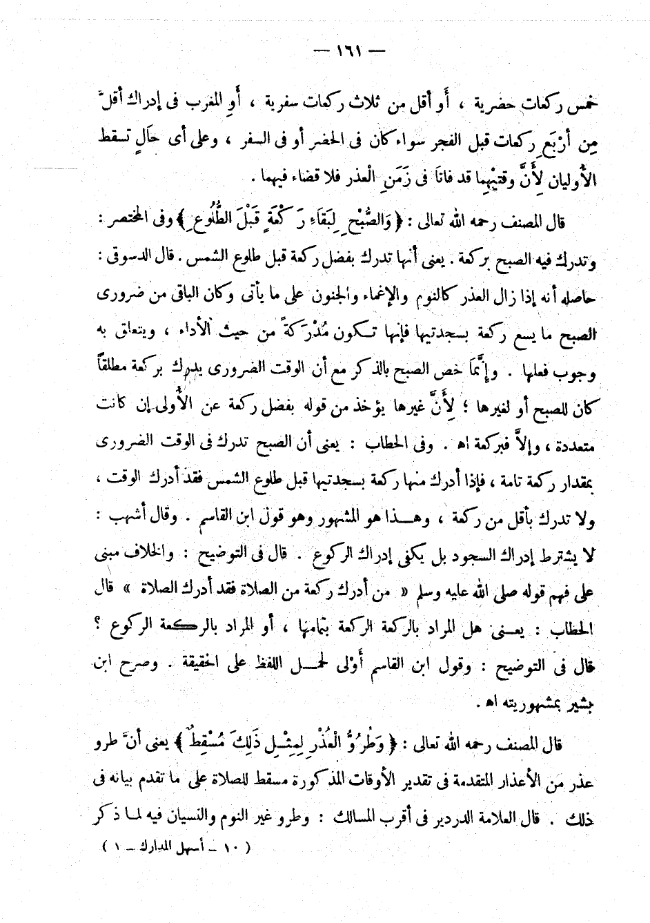 قال الدسوقي: حاصله أنه إذا زال العذر كالنوم والإغماء والجنون على ما يأتي وكان الباقي من ضروري الصبح ما يسع ركعة بسجدتيها فإنها تكون مدركة من حيث الأداء، ويتعلق به وجوب فعلها. وإنما خص الصبح بالذكر مع أن الوقت الضروري يدرك بركعة مطلقا كان للصبح أو لغيرها؛ لأن غيرها يؤخذ من قوله بفضل ركعة عن الأولى إن كانت متعددة، وإلا فبركعة اهـ. وفي الحطاب: يعني أن الصبح تدرك في الوقت الضروري بمقدار ركعة تامة، فإذا أدرك منها ركعة، وهذا المشهور وهو قول ابن القاسم. وقال أشهب: لا يشترط إدراك السجود بل يكفي إدراك الركوع قال في التوضيح: والخلاف مبني على فهم قوله صلى الله عليه وسلم: " من أدرك ركعة من الصلاة فقد أدرك الصلاة " قال الحطاب: يعني هل المراد بالركعة الركعة بتمامها، أو المراد بالركعة الركوع؟ قال في التوضيح: وقول ابن القاسم أولى لحمل اللفظ على الحقيقة. وصرح ابن بشير بمشهوريته اهـ.