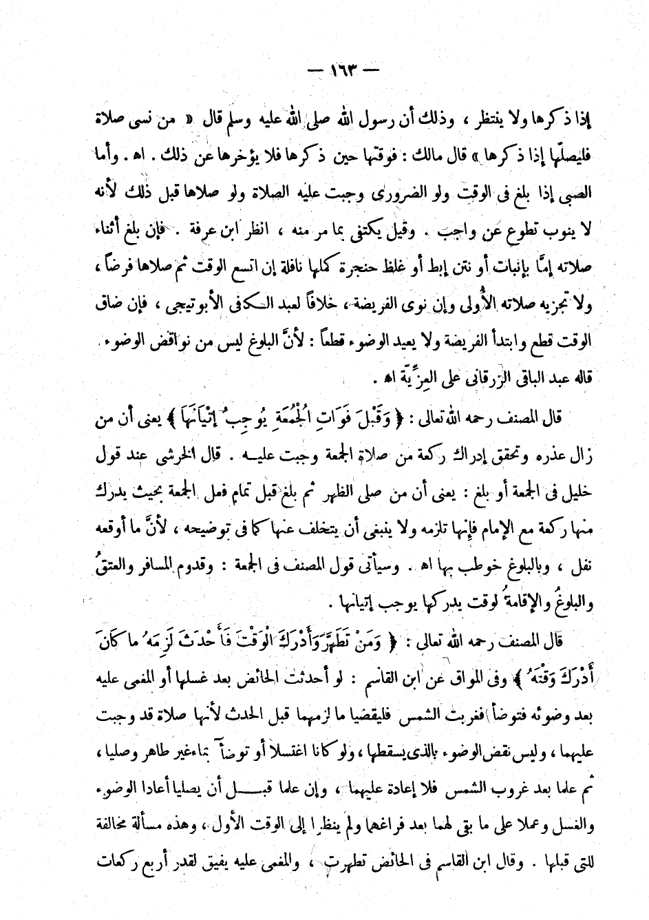 إذا ذكرها ولا ينتظر، وذلك أن رسول الله صلى الله عليه وسلم قال: " من نسي صلاة فليصلها إذا ذكرها " قال مالك: فوقتها حين ذكرها فلا يؤخرها عن ذلك. اهـ. وأما الصبي إذا بلغ في الوقت ولو الضروري وجبت عليه الصلاة ولو صلاها قبل ذلك لأنه لا ينوب تطوع عن واجب. وقيل يكتفي بما مر منه، انظر ابن عرفة. فإن بلغ أثناء صلاته إما بإنبات أو نتن إبط أو غلظ حنجرة كملها نافلة إن اتسع الوقت ثم صلاها فرضا، ولا تجزيه صلاته الأولى وإن نوى الفريضة، خلافا لعبد الكافي الأبوتيجي، فإن
