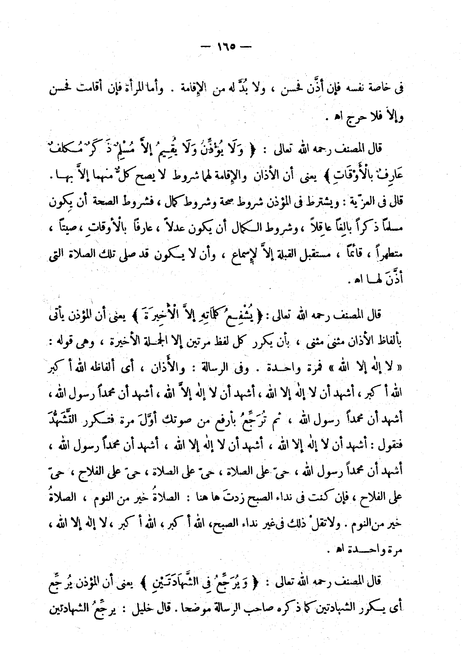 قال المصنف رحمه الله تعالى: " يشفع كلماته إلا الأخيرة " يعني أن المؤذن يأتي بألفاظ الأذان مثنى مثنى، بأن يكرر كل لفظ مرتين إلا الجملة الأخيرة، وهي قوله " لا إله إلا الله " فمرة واحدة. وفي الرسالة: والأذان، أي ألفاظه الله أكبر، الله أكبر، أشهد أن لا إله إلا الله، أشهد أن لا إله إلا الله، أشهد أن محمدا رسول الله، أشهد أن محمدا رسول الله، ثم ترجع بأرفع من صوتك أول مرة فتكرر التشهد فتقول: أشهد أن لا إله إلا الله، أشهد أن لا إله إلا الله، أشهد أن محمدا رسول الله، حي على الصلاة، حي على الصلاة، حي على الفلاح، حي على الفلاح، فإن كنت في نداء الصبح زدت ها هنا: الصلاة خير من النوم، الصلاة خير من النوم.