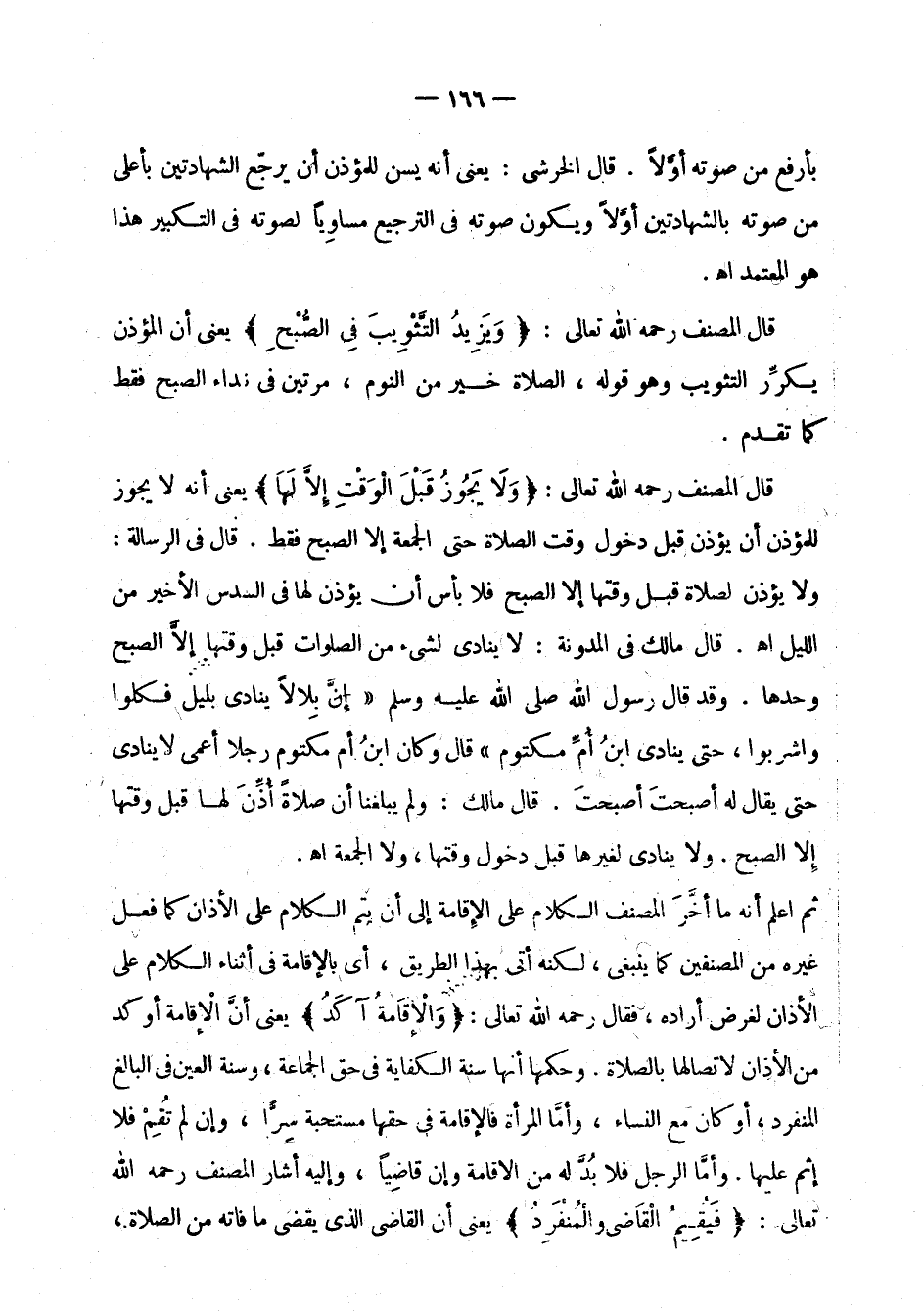 ثم اعلم أنه ما أخر المصنف الكلام على الإقامة إلى أن يتم الكلام على الأذان كما فعل غيره من المصنفين كما ينبغي، لكنه أتى بهذا الطريق، أي بالإقامة في أثناء الكلام على الأذان لغرض أراده، فقال رحمه الله تعالى: " والإقامة آكد " يعني أن الإقامة أوكد من الأذان لاتصالها بالصلاة. وحكمها أنها سنة الكفاية في حق الجماعة، وسنة العين في البالغ المنفرد، أو كان مع النساء، وأما المرأة فالإقامة في حقها مستحبة سرا، وإن لم تقم فلا إثم عليها. وأما الرجل فلا بد له من الإقامة وإن قاضيا، وإليه أشار المصنف رحمه الله تعالى: " فيقيم القاضي والمنفرد " يعني أن القاضي الذي يقضي ما فاته من الصلاة،