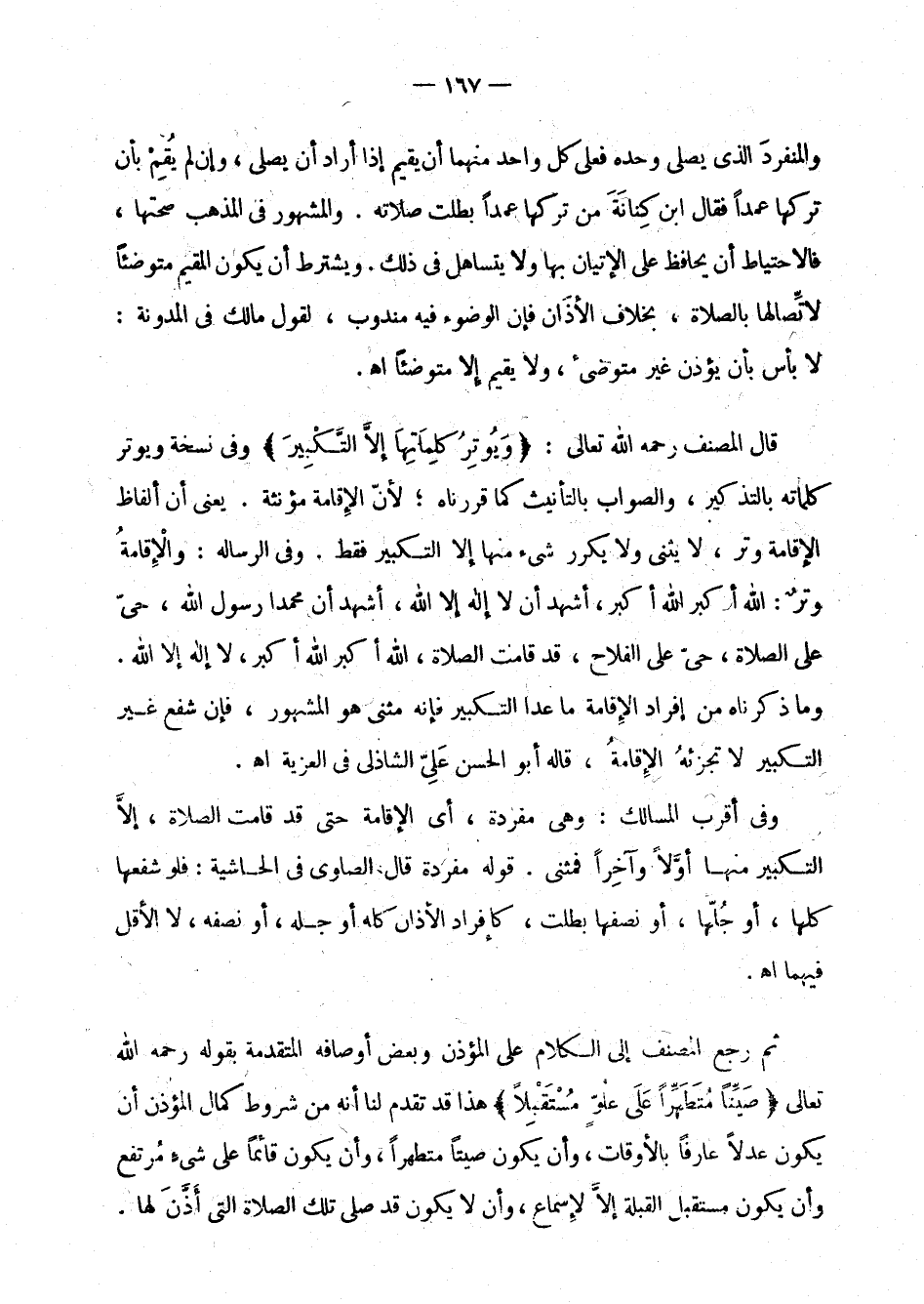 والمنفرد الذي يصلي وحده فعلى كل واحد منهما أن يقيم إذا أراد أن يصلي، وإن لم يقم بأن تركها عمدا فقال ابن كنانة من تركها عمدا بطلت صلاته. والمشهور في المذهب صحتها، فالاحتياط أن يحافظ على الإتيان بها ولا يتساهل في ذلك. ويشترط أن يكون المقيم متوضئا لاتصالها بالصلاة، بخلاف الأذان فإن الوضوء فيه مندوب، لقول مالك في المدونة: لا بأس بأن يؤذن غير متوضئ، ولا يقيم ويشترط أن يكون المقيم متوضئا لاتصالها بالصلاة، بخلاف الأذان فإن الوضوء فيه مندوب، لقول مالك في المدونة: لا بأس بأن يؤذن غير متوضئ، ولا يقيم ويشترط أن يكون المقيم متوضئا لاتصالها بالصلاة، بخلاف الأذان فإن الوضوء فيه مندوب، لقول مالك في المدونة: لا بأس بأن يؤذن غير متوضئ، ولا يقيم إلا متوضئا اهـ.