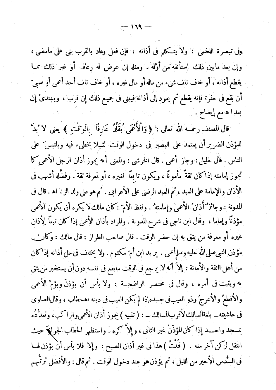 قال المصنف رحمه الله تعالى: " والأعمى يقلد عارفا بالوقت " يعني لا بد للمؤذن الضرير أن يعتمد على البصير في دخول الوقت لئلا يخطئ فيه ويلتبس على الناس. قال خليل: وجاز أعمى. قال الخرشي: والمعنى أنه يجوز أذان الرجل الأعمى كما تجوز إمامته إذا كان ثقة مأمونا، ويكون تابعا لغيره، أو لمعرفة ثقة. وفضله أشهب في الأذان والإمامة على العبد