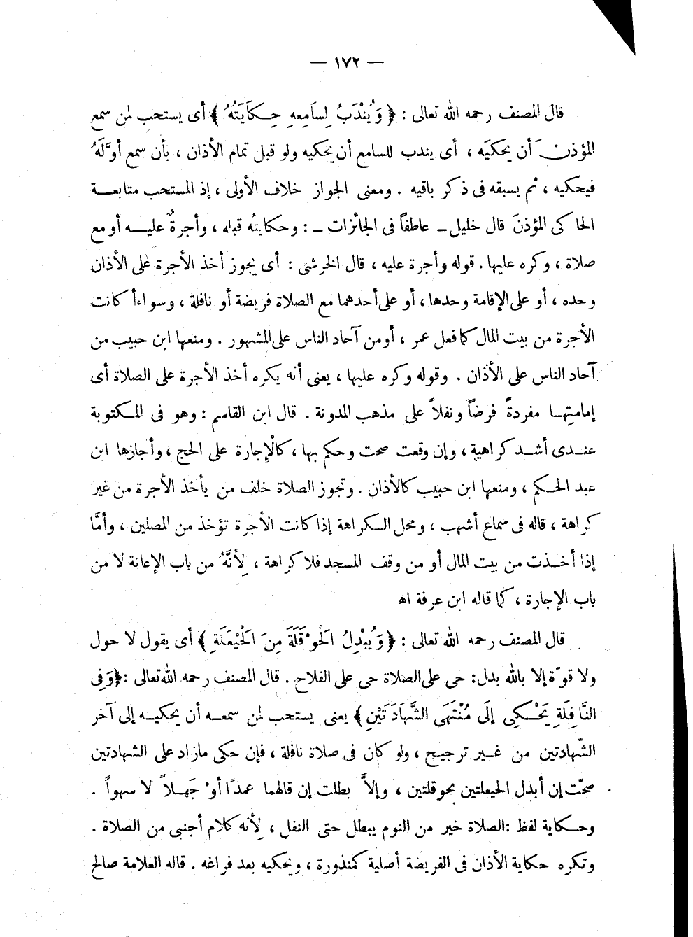 قال المصنف رحمه الله تعالى: " ويندب لسامعه حكايته " أي يستحب لمن سمع المؤذن أن يحكيه، أي يندب للسامع أن يحكيه ولو قبل تمام الأذان، بأن سمع أوله فيحكيه، ثم يسبقه في ذكر باقيه. ومعنى الجواز خلاف الأولى، إذ المستحب متابعة الحاكي المؤذن قال خليل - عاطفا في الجائزات -: وحكايته قبله، وأجرة عليه أو مع صلاة، وكره عليها. قوله وأجرة عليه، قال الخرشي: أي يجوز أخذ الأجرة على الأذان وحده، أو على الإقامة وحدها، أو على أحدهما مع الصلاة فريضة أو نافلة، وسواء أكانت الأجرة من بيت المال كما فعل عمر، أو من آحاد الناس على المشهور. ومنعها ابن حبيب من آحاد الناس على الأذان. وقوله وكره عليها، يعني أنه يكره أخذ الأجرة على الصلاة أي إمامتها مفردة فرضا ونفلا على مذهب المدونة. قال ابن القاسم: وهو في المكتوبة عندي أشد كراهية، وإن وقعت صحت وحكم بها، كالإجارة على الحج، وأجازها ابن عبد الحكم، ومنها ابن حبيب كالأذان. وتجوز الصلاة خلف من يأخذ الأجرة من غير كراهة، قاله في سماع أشهب، ومحل الكراهة إذا كانت الأجرة تؤخذ من المصلين، وأما إذا أخذت من بيت المال أو من وقف المسجد فلا كراهة، لأنه من باب الإعانة لا من باب الإجازة، كما قاله ابن عرفة اهـ.