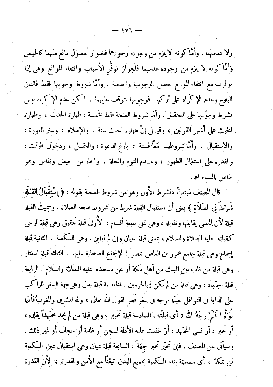 قال المصنف مبتدئا بالشرط الأول وهو من شروط الصحة بقوله: " استقبال القبلة شرط في الصلاة " يعني أن استقبال القبلة شرط من شروط صحة الصلاة.