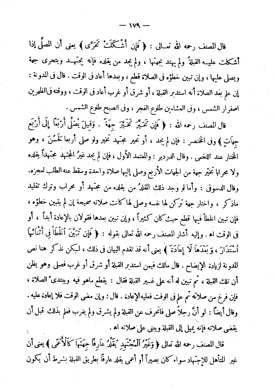 وإليه أشار المصنف رحمه الله تعالى بقوله: " فإن تبين الخطأ في أثنائها استدار وبعدها لا إعادة " يعني أنه قد تقدم البيان في ذلك، لكن نذكر هنا نص المدونة لزيادة الإيضاح. قال مالك فيمن استدبر القبلة أو شرق أو غرب فصلى وهو يظن أن تلك القبلة، ثم تبين له أنه على غير القبلة فقال: يقطع ما هو فيه ويبتدئ الصلاة، فإن فرغ من صلاته ثم علم في الوقت فعليه الإعادة. قال: وإن مضى الوقت فلا إعادة عليه. وقال أيضا: لو أن رجلا صلى فانحرف عن القبلة ولم يشرق ولم يغرب فعلم بذلك قبل أن يقضي صلاته فإنه يميل إلى القبلة ويبني على صلاته اهـ.