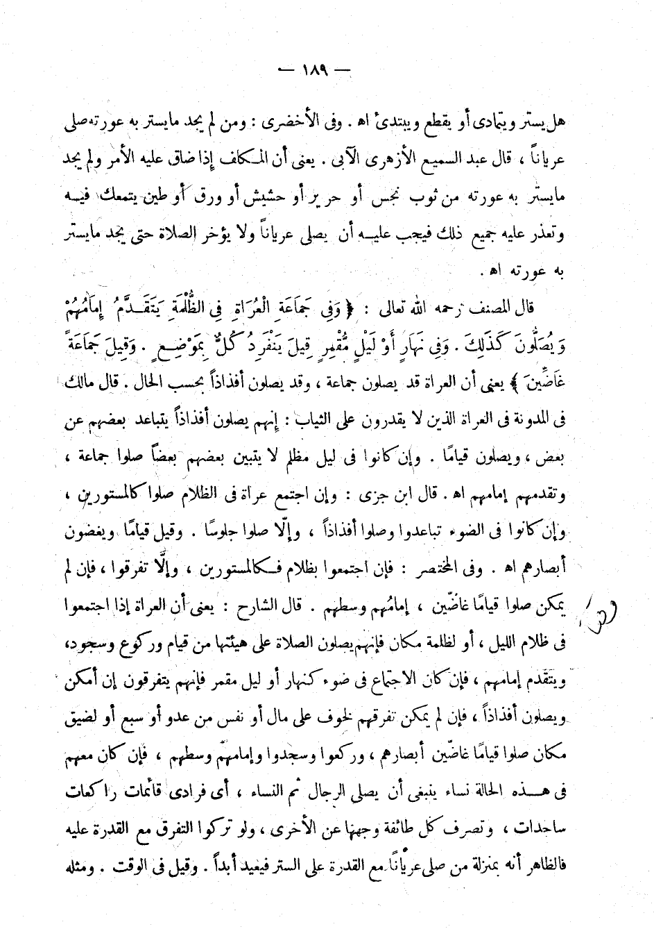 قال المصنف رحمه الله تعالى: " وفي جماعة العراة في الظلمة يتقدم إمامهم ويصلون كذلك. وفي نهار أو ليل مقمر قيل ينفرد كل بموضع. وقيل جماعة غاضين " يعني أن العراة الذين لا يقدرون على الثياب: إنهم يصلون أفذاذا يتباعد بعضهم عن بعض، ويصلون قياما. وإن كانوا في ليل مظلم لا يتبين بعضهم بعضا صلوا جماعة، وتقدمهم إمامهم اهـ. قال ابن جزي: وإن اجتمع عراة في الظلام صلوا كالمستورين، وإن كانوا في الضوء تباعدوا وصلوا أفذاذا، وإلا صلوا جلوسا. وقيل قياما ويغضون أبصارهم اهـ. وفي المختصر: فإن اجتمعوا بظلام فكالمستورين، وإلا تفرقوا، فإن لم يمكن صلوا قياما غاضين، إمامهم وسطهم.