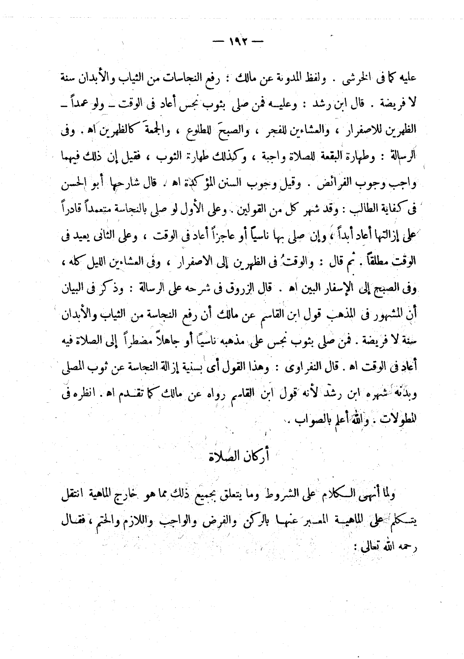 عليه كما في الخرشي. ولفظ المدونة عن مالك: رفع النجاسات من الثياب والأبدان سنة لا فريضة. قال ابن رشد: وعليه فمن صلى بثوب نجس أعاد في الوقت - ولو عمدا - الظهرين للاصفرار، والعشاءين للفجر، والصبح للطلوع، والجمعة كالظهرين اهـ. وفي الرسالة: وطهارة البقعة للصلاة واجبة، وكذلك طهارة الثوب، فقيل إن ذلك فيهما واجب وجوب الفرائض. وقيل وجوب السنن المؤكدة اهـ. قال شارحها أبو الحسن في كفاية الطالب: وقد شهر كل من القولين. وعلى الأول لو صلى بالنجاسة متعمدا قادرا على إزالتها أعاد أبدا، وإن صلى بها ناسيا أو عاجزا أعاد في الوقت، وعلى الثاني يعيد في الوقت مطلقا. ثم قال: والوقت في الظهرين إلى الاصفرار، وفي العشاءين الليل كله، وفي الصبح إلى الإسفار اهـ. قال الزروق في شرحه على الرسالة: وذكر في البيان أن المشهور في المذهب قول ابن القاسم عن مالك أن رفع النجاسة من الثياب والأبدان سنة لا فريضة. فمن صلى بثوب نجس على مذهبه ناسيا أو جاهلا مضطرا إلى الصلاة فيه أعاد في الوقت اهـ. قال النفراوي: وهذا القول أي بسنية إزالة النجاسة عن ثوب المصلي وبدنه شهره ابن رشد لأنه قول ابن القاسم رواه عن مالك كما تقدم اهـ. انظره في المطولات. والله أعلم بالصواب.