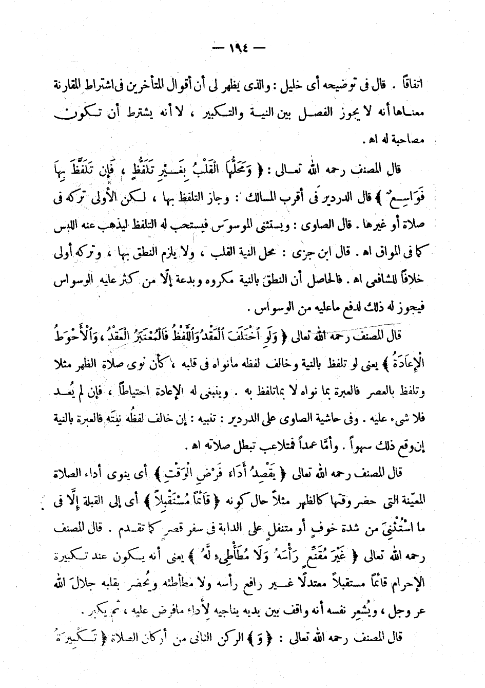 قال المصنف رحمه الله تعالى: " ومحلها القلب بغير تلفظ، فإن تلفظ بها فواسع " قال الدردير في أقرب المسالك: وجاز التلفظ بها، لكن الأولى تركه في صلاة أو غيرها. قال الصاوي: ويستثنى الموسوس فيستحب له التلفظ ليذهب عنه اللبس كما في المواق اهـ. قال ابن جزي: محل النية القلب، ولا يلزم النطق بها، وتركه أولى خلافا للشافعي اهـ. فالحاصل أن النطق بالنية مكروه وبدعة إلا