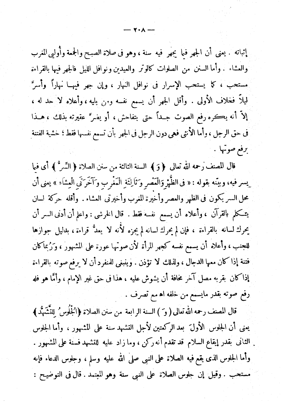 إثباته. يعني أن الجهر فيما يجهر فيه سنة، وهو في صلاة الصبح والجمعة وأوليي المغرب والعشاء. وأما السنن من الصلوات كالوتر والعيدين ونوافل الليل فالجهر فيها بالقراءة مستحب، كما يستحب الإسرار في نوافل النهار، وإن جهر فيها نهارا وأسر ليلا فخلاف الأولى. وأقل الجهر أن يسمع نفسه ومن يليه، وأعلاه لا حد له، إلا أنه يكره رفع الصوت جدا حتى يتفاحش، أو يضر