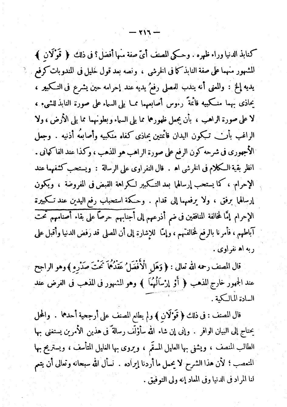 كنابذ الدنيا وراء ظهره. وحكى المصنف أي صفة منها أفضل؟ في ذلك " قولان " المشهور منهما على صفة النابذ كما في الخرشي، ونصه بعد قول خليل في المندوبات كرفع يديه إلخ: والمعنى أنه يندب للمصلي رفع يديه عند إحرامه حين يشرع في التكبير، يحاذي بهما منكبيه قائمة رؤوس أصابعهما مما يلي السماء على صورة النابذ للشيء، لا على صورة الراهب، بأن يجعل ظهورهما مما يلي السماء وبطونهما مما يلي الأرض، ولا الراغب بأن تكون اليدان قائمتين يحاذي كفاه منكبيه وأصابعه أذنيه. وجعل الأجهوري في شرحه كون الرفع على صورة الراهب هو المذهب، وكذا عند الفاكهاني. انظر بقية الكلام في الخرشي اهـ. قال النفراوي على الرسالة: ويستحب كشفهما عند الإحرام، كما يستحب إرسالهما بعد التكبير لكراهة القبض في المفروضة، ويكون إرسالهما برفق، ولا يرفعهما إلى قدام. وحكمة استحباب رفع اليدين عند تكبيرة الإحرام إما لمخالفة المنافقين في ضم أذرعهم إلى أجنابهم حرصا على بقاء أصنامهم تحت آباطهم، فأمرنا بالرفع لمخالفتهم، وإما للإشارة إلى أن المصلي قد رفض الدنيا وأقبل على ربه اهـ النفراوي.