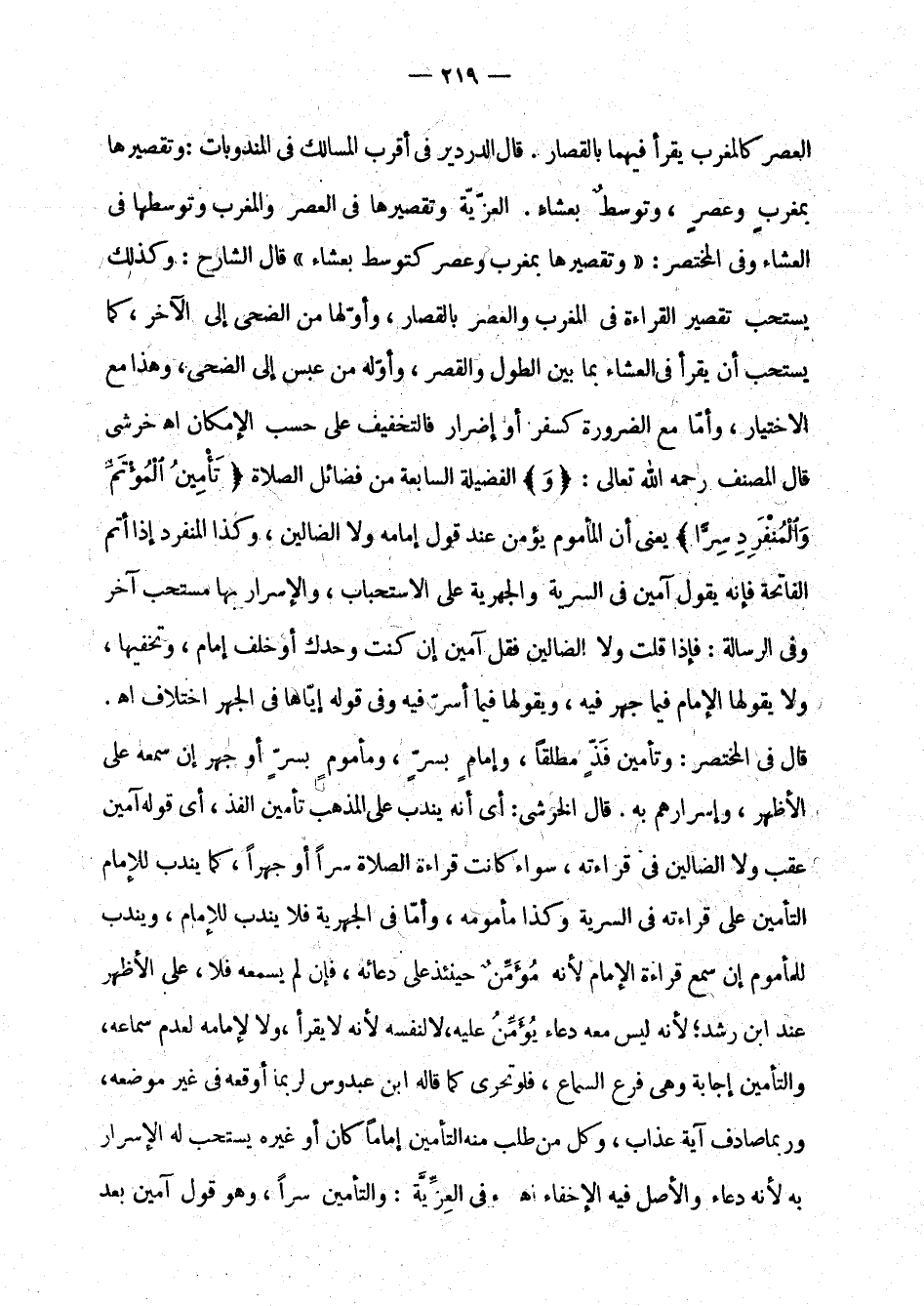 العصر كالمغرب يقرأ فيهما بالقصار. قال الدردير في أقرب المسالك في المندوبات: وتقصيرها بمغرب وعصر، وتوسط بعشاء. العزية وتقصيرها في العصر والمغرب وتوسطها في العشاء وفي المختصر: " وتقصيرها بمغرب وعصر كتوسط بعشاء " قال الشارح: وكذلك يستحب تقصير القراءة في المغرب والعصر بالقصار، وأولها من الضحى إلى الآخر، كما يستحب أن يقرأ العشاء بما بين الطول والقصر، وأوله من عبس إلى الضحى، وهذا مع الاختيار، وأما مع الضرورة كسفر أو إضرار فالتخفيف على حسب الإمكان اهـ الخرشي، قال المصنف رحمه الله تعالى: " و " الفضيلة السابعة من فضائل الصلاة " تأمين المؤتم والمنفرد سرا " يعني أن المأموم يؤمن عند قول إمامه ولا الضالين، وكذا المنفرد إذا أتم الفاتحة فإنه يقول آمين في السرية والجهرية على الاستحباب، والإسرار بها مستحب آخر وفي الرسالة: فإذا قلت ولا الضالين