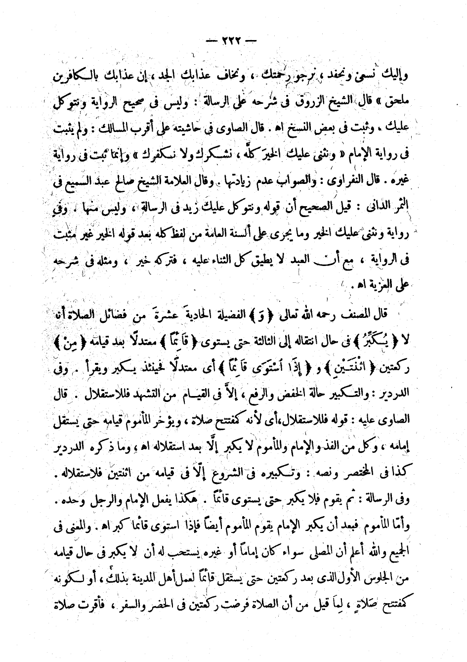 رواية غيره. قال النفراوي: والصواب عدم زيادتها. وقال العلامة الشيخ صالح عبد السميع في الثمر الداني: قيل الصحيح أن قوله ونتوكل عليك زيد في الرسالة، وليس منها. وفي رواية ونثني عليك الخير وما يجري على ألسنة العامة من لفظ كله بعد قوله الخير غير مثبت في الرواية، مع أن العبد لا يطيق كل الثناء عليه، فتركه خير، ومثله في شرحه على العزية اهـ.
