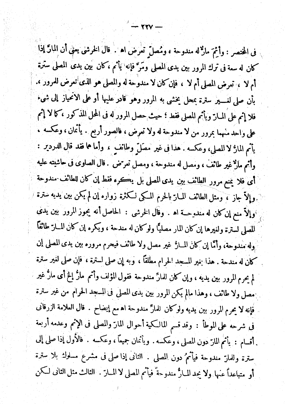 شرحه على الموطأ: وقد قسم المالكية أحوال المار والمصلي في الإثم وعدمه أربعة أقسام: يأثم المار دون المصلي، وعكسه. ويأثمان جميعا، وعكسه. فالأول إذا صلى إلى سترة وللمار مندوحة فيأثم دون المصلي. الثاني إذا صلى في مشرع مسلوك بلا سترة أو متباعدا عنها ولا يجد المار مندوحة فيأثم المصلي لا المار. الثالث مثل الثاني لكن