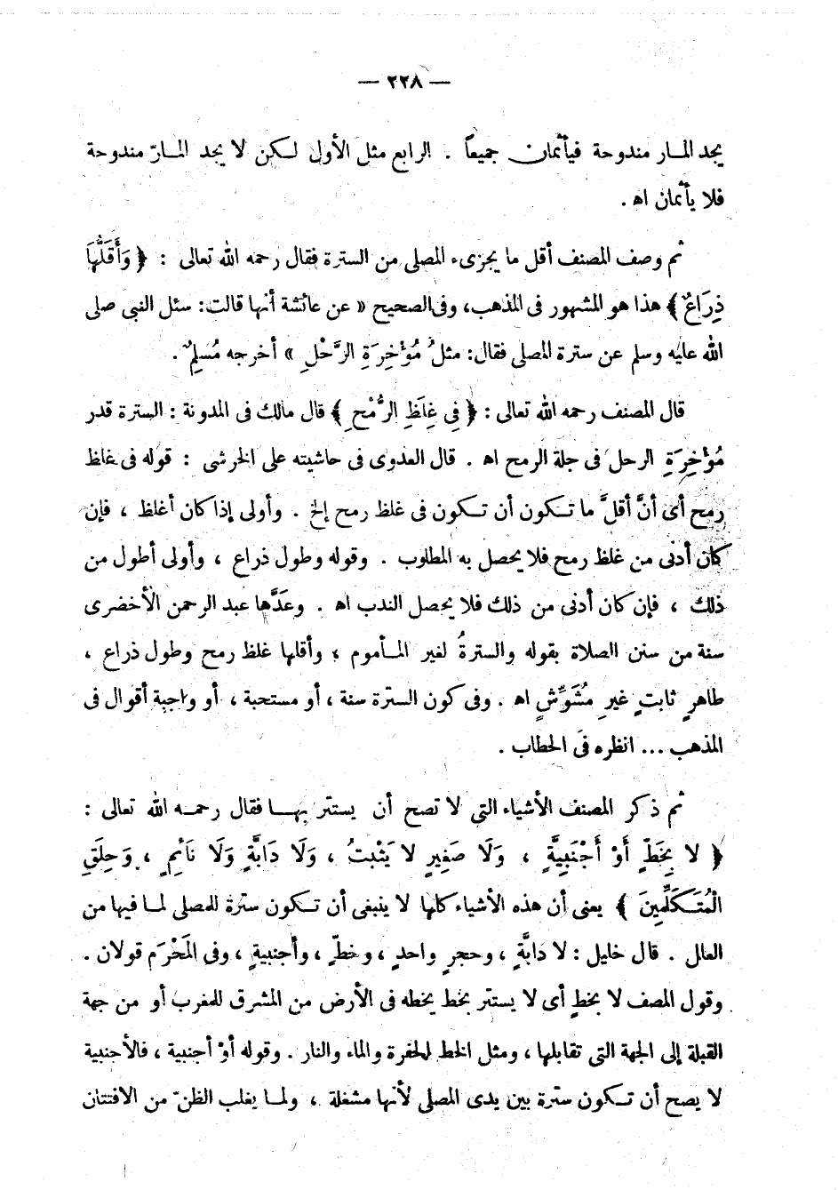 ثم ذكر المصنف الأشياء التي لا تصح أن يستتر بها فقال رحمه الله تعالى: " لا بخط أو أجنبية، ولا صغير لا يثبت، ولا دابة ولا نائم، وحلق المتكلمين " يعني أن هذه الأشياء كلها لا ينبغي أن تكون سترة للمصلي لما فيها من العلل. قال خليل: لا دابة، وحجر واحد، وخط، وأجنبية، وفي المحرم قولان. وقول المصنف لا بخط أي لا يستتر بخط يخطه في الأرض من المشرق للمغرب أو من جهة القبلة إلى الجهة التي تقابلها، ومثل الخط الحفرة والماء والنار. وقوله أو أجنبية، فالأجنبية لا يصح سترة بين يدي المصلي لأنها مشتغلة، ولما يغلب الظن من الافتنان