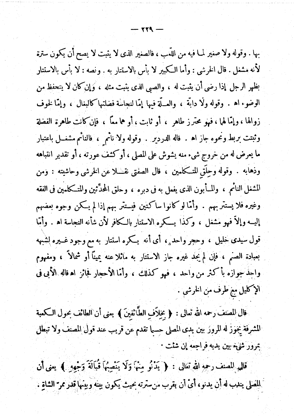 الدردير. قوله ولا نائم، فالنائم مشغل باعتبار ما يعرض له من خروج شيء منه يشوش على المصلي، أو كشف عورته، أو تقدير انتباهه وذهابه. وقوله وحلق المتكلمين، قال الصفتي نقلا عن الخرشي وحاشيته: ومن المشغل النائم، والمأبون الذي يفعل به في دبره، وحلق المحدثين والمتكلمين في الفقه وغيره فلا يستتر بهم. وأما لو كانوا ساكتين فيستتر بهم إذا لم يكن وجوه بعضهم إليه وإلا فهو مشغل، وكذا يكره الاستتار بالكافر لأن شأنه النجاسة اهـ. وأما قول سيدي خليل: وحجر واحد، أي أنه يكره استتار به مع وجود غيره لشبهه بعبادة الصنم، فإن لم يجد غيره جاز الاستتار به مائلا عنه يمينا أو شمالا، ومفهوم واحد جوازه بأكثر من واحد، فهو كذلك، وأما الأحجار فجائز اهـ قاله الأبي في الإكليل مع طرف من الخرشي.