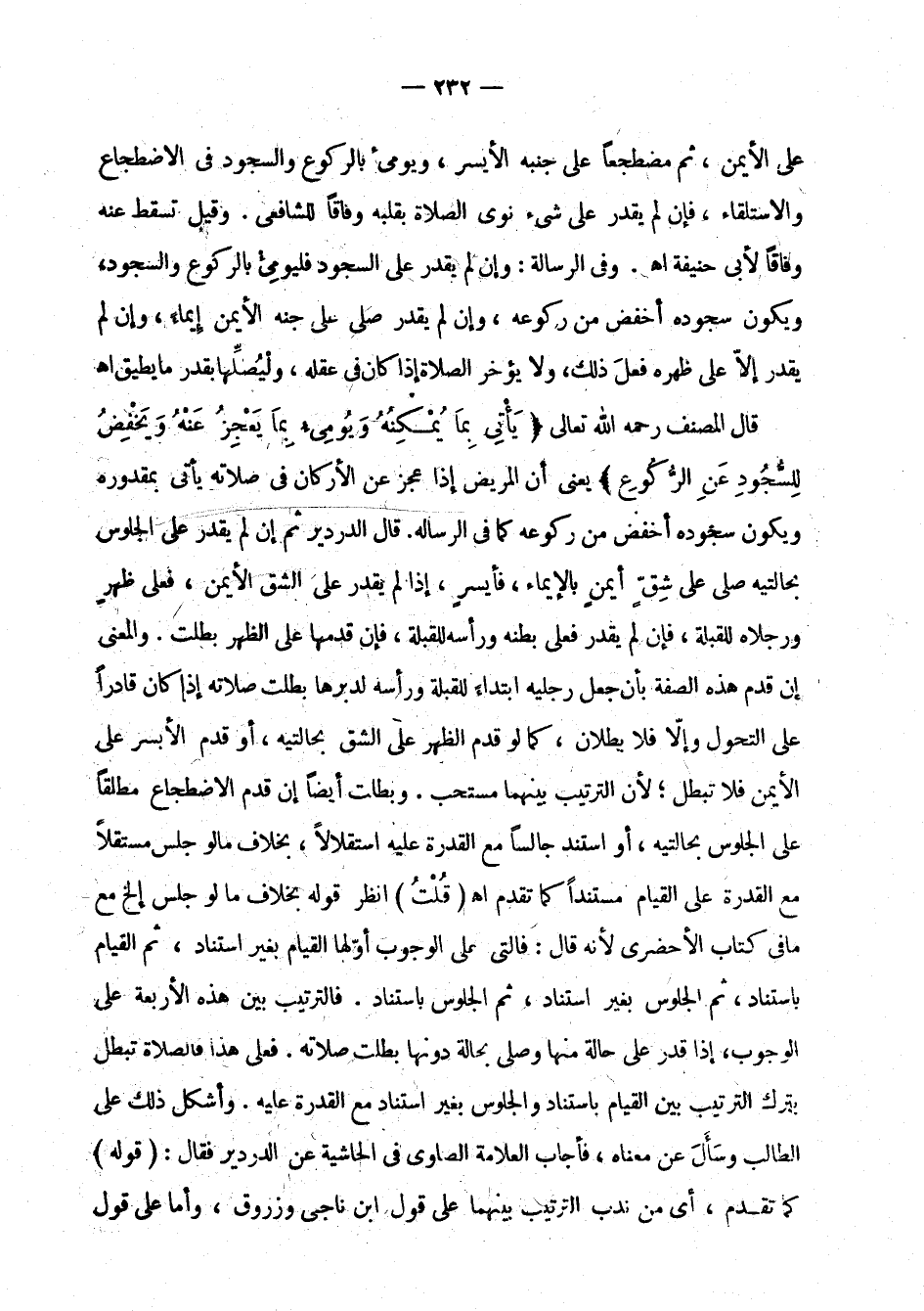 في الاضطجاع والاستلقاء، فإن لم يقدر على شيء نوى الصلاة بقلبه وفاقا للشافعي. وقيل تسقط عنه وفاقا لأبي حنيفة اهـ. وفي الرسالة: وإن لم يقدر على السجود فليومئ بالركوع والسجود، ويكون سجوده أخفض من ركوعه، وإن لم يقدر صلى على جنبه الأيمن إيماء، وإن لم يقدر إلا على ظهره فعل ذلك، ولا يؤخر لصلاة إذا كان في عقله، وليصلها بقدر ما يطيق اهـ.