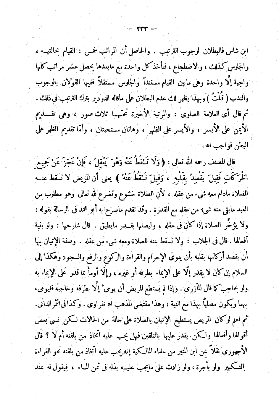 والحاصل أن المراتب خمس: القيام بحالتيه، والجلوس كذلك، والاضطجاع، فتأخذ كل واحدة مع ما بعدها يحصل عشر مراتب كلها واجبة إلا واحدة وهي ما بين القيام مستندا والجلوس مستقلا ففيها القولان بالوجوب والندب قلت: وبهذا يظهر لك عدم البطلان على ما قاله الدردير بترك الترتيب في ذلك. ثم قال أي العلامة الصاوي: والمرتبة الأخيرة تحتها ثلاث صور، وهي تقديم الأيمن على الأيسر، والأيسر على الظهر، وهاتان مستحبتان، وأما تقديم الظهر على البطن فواجب اهـ.