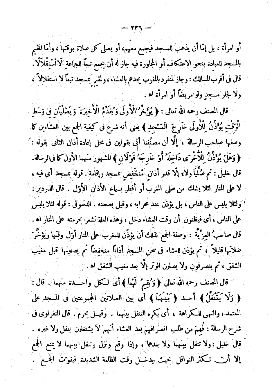 قال المصنف رحمه الله تعالى: " ويقين لهما " أي لكل واحدة منهما. قال: " ولا يتنفل " أحد " بينهما " أي بين الصلاتين المجموعتين في المسجد على المعتمد، والنهي للكراهة، أي يكره التنفل بينهما. وقيل يحرم. قال النفراوي في شرح الرسالة: فهم من طلب انصرافهم بعد العشاء أنهم لا يشتغلون بنفل ولا غيره. قال خليل: ولا تنفل بينهما ولا بعدهما، وإذا وقع ونزل بينهما لا يمنع الجمع إلا أن تكثر النوافل بحيث يدخل وقت الظلمة الشديدة فيفوت الجمع.