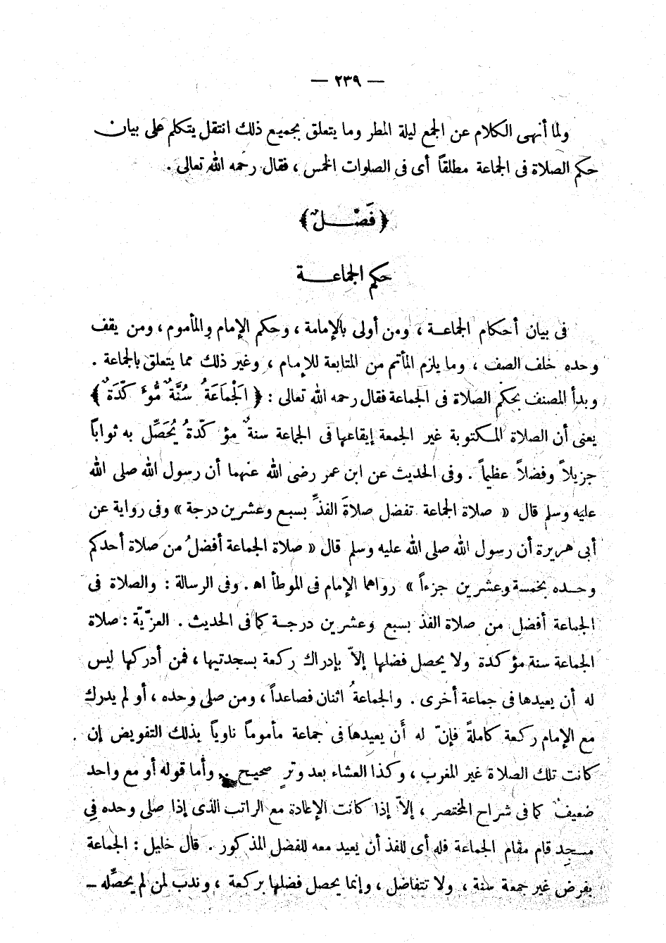 ولما أنهى الكلام على الجمع ليلة المطر وما يتعلق بجميع ذلك يتكلم على بيان حكم الصلاة في الجماعة مطلقا أي في الصلوات الخمس، فقال رحمه الله تعالى.