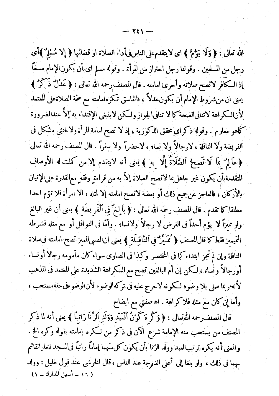 الله تعالى: " ولا يؤم " أي لا يتقدم على الناس في أداء الصلاة أو قضائها " إلا مسلم " أي رجل من المسلمين. وقولنا رجل احتراز من المرأة. وقوله مسلم: أي بأن الإمام مسلما لإذ الكافر لا تصح صلاته وأحرى إمامته.