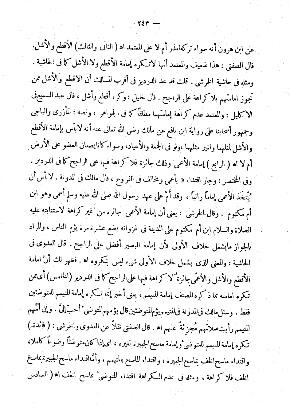 عن ابن هارون أنه سواء تركه لعذر أم لا على المعتمد اهـ، الثاني والثالث: الأقطع والأشل. قال الصفتي: هذا ضعيف والمعتمد أنها لا تكره إمامة الأقطع ولا الأشل كما في الحاشية. ومثله في حاشية الخرشي. قلت قد عد الدردير في أقرب المسالك أن الأقطع والأشل ممن تجوز إمامتهم بلا كراهة على الراجح. قال خليل: وكره أقطع وأشل، قال عبد السميع في الإكليل: والمعتمد عدم كراهة إمامتها مطلقا كما في الجواهر، ونصه: المأزري والباجي وجمهور أصحابنا على رواية ابن نافع عن مالك، رضي الله تعالى عنه، أنه لا بأس بإمامة الأقطع والأشل لمثلهما ولغير مثلهما، ولو في الجمعة والأعياد، وسواء كانا يضعان العضو على الأرض أم لا اهـ. الرابع: إمامة الأعمى وتلك جائزة فلا كراهة فيها على الراجح كما في الدردير. وفي المختصر: وجاز اقتداء بأعمى ومخالف في الفروع، قال مالك في المدونة: لا بأس أن يتخذ الأعمى إماما راتبا، وقد أم على عهد رسول الله صلى الله عليه وسلم أعمى وهو ابن أم مكتوم. وقال الخرشي: يعني أن إمامة الأعمى جائزة من غير كراهة لاستنابته عليه الصلاة والسلام ابن أم مكتوم على المدينة في غزواته بضع عشرة مرة يؤم الناس، والمراد بالجواز ما يشمل خلاف الأولى لأن إمامة البصير أفضل على الراجح. قال العدوي في الحاشية: والمعنى الذي يشمل خلاف الأولى شيء ليس بمكروه اهـ. فظهر لك أن إمامة الأقطع والأشل والأعمى جائزة لا كراهة فيها على الراجح كما في الدردير الخامس: أي ممن تكره إمامته مما ذكره المصنف إمامة المتيمم، يعني أخبر إنما تكره إمامة المتيمم للمتوضئين فقط. وسئل مالك في المدونة في المتيمم يؤم المتوضئين قال يؤمهم المتوضئ أحب إلي. وإن أمهم المتيمم رأيت صلاتهم مجزئة عنهم اهـ. قال الصفتي نقلا عن العدوي والخرشي: فائدة: تكره إمامة المتيمم للمتوضئ وإمامة ماسح الجبيرة لغيره، أي إذا كان متوضئا وضوءا كاملا، واقتداء ماسح الخف بماسح الجبيرة، واقتداء الماسح بالمتيمم، وأما اقتداء ماسح الجبيرة بماسح الخف فلا كراهة، ومثله في عدم الكراهة اقتداء المتوضئ بماسح الخف اهـ، السادس