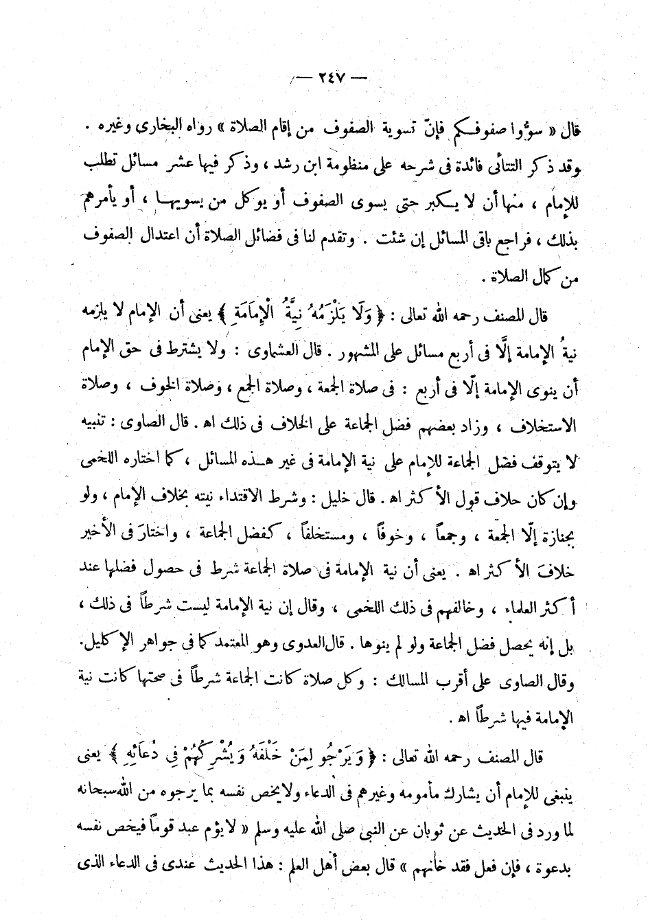 قال: " سووا صفوفكم فإن تسوية الصفوف من إقام الصلاة " رواه البخاري وغيره. وقد ذكر التتائي فائدة في شرحه على منظومة ابن رشد، وذكر فيها عشر مسائل تطلب للإمام، منها أن لا يكبر حتى يسوي الصفوف أو يوكل من يسويها، أو يأمرهم بذلك، فراجع باقي المسائل إن شئت. وتقدم لنا في فضائل الصلاة أن اعتدال الصفوف من كمال الصلاة.