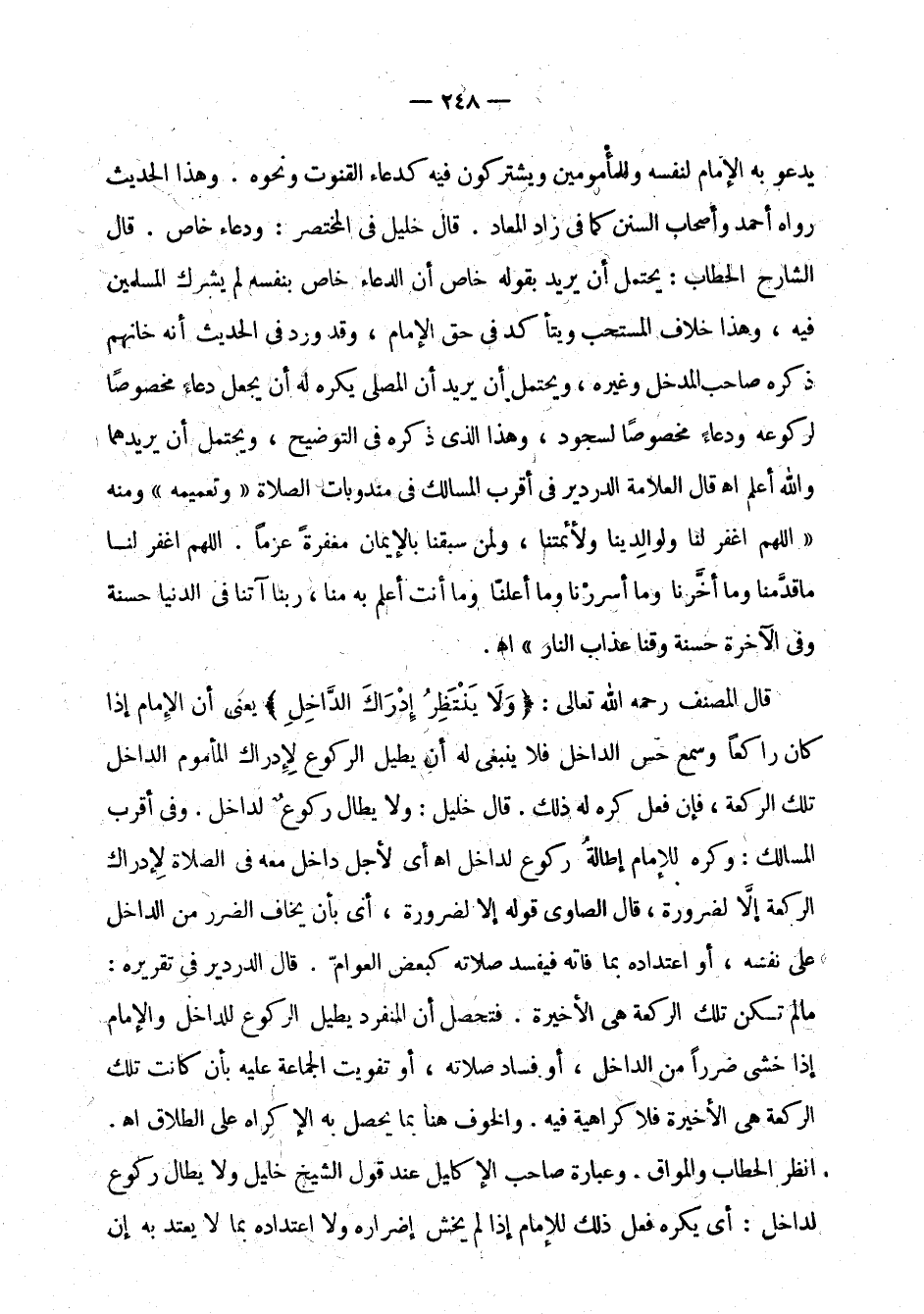 قال المصنف رحمه الله تعالى: " ولا ينتظر إدراك الداخل " يعني أن الإمام إذا كان راكعا وسمع حس الداخل فلا ينبغي له أن يطيل الركوع لإدراك المأموم الداخل تلك الركعة، فإن فعل كره له ذلك. قال خليل: ولا يطال ركوع لداخل. وفي أقرب المسالك: وكره للإمام إطالة ركوع الداخل اهـ، أي لأجل داخل معه في الصلاة إدراك الركعة إلا لضرورة، قال الصاوي قوله: إلا لضرورة، أي بأن يخاف الضرر من الداخل على نفسه، أو اعتداه بما فاته فيفسد صلاته كبعض العوام. قال الدردير في تقريره: ما لم تكن تلك الركعة هي الأخيرة. فتحصل أن المنفرد يطيل الركوع للداخل والإمام إذا خشي ضررا من الداخل، أو فساد صلاته، أو تفويت الجماعة عليه بأن كانت تلك الركعة هي الأخيرة فلا كراهية فيه. والخوف هنا بما يحصل به الإكراه على الطلاق اهـ. انظر الحطاب والمواق. وعبارة صاحب الإكليل عند قول الشيخ خليل ولا يطال ركوع لداخل: أي يكره فعل ذلك للإمام إذا لم يخش إضراره ولا اعتداه بما لا يعتد به إن
