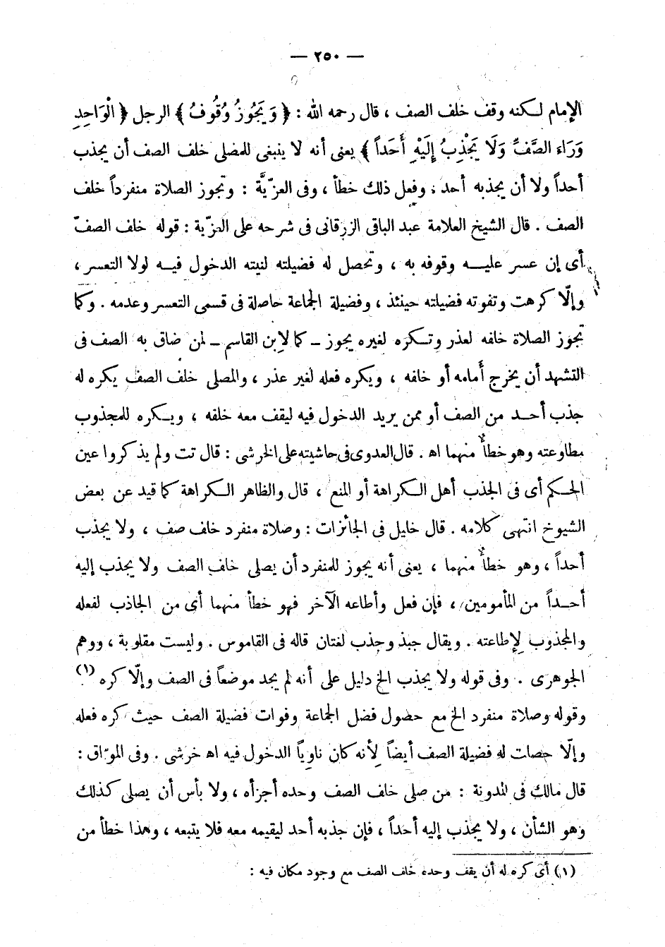 الإمام لكنه وقف خلف الصف. قال رحمه الله: " ويجوز وقوف " الرجل " الواحد وراء الصف ولا يجذب إليه أحدا " يعني أنه لا ينبغي للمصلي خلف الصف أن يجذب أحدا ولا أن يجذبه أحد وفعل ذلك خطأ، وفي العزية: وتجوز الصلاة منفردا خلف الصف. قال الشيخ العلامة عبد الباقي الزرقاني في شرحه على العزية: قوله خلف الصف أي إن عسر عليه وقوفه به، وتحصل له فضيلته لنيته الدخول فيه لولا التعسر، وإلا كرهت وتفوته فضيلته حينئذ، وفضيلة الجماعة حاصلة في قسمي التعسر وعدمه. وكما تجوز الصلاة خلفه لعذر وتكره لغيره يجوز - كما لابن القاسم - لمن ضاق به الصف في التشهد أن يخرج أمامه أو خلفه، ويكره فعله لغير عذر، والمصلي خلف الصف يكره له جذب أحد من الصف أو ممن يريد الدخول فيه ليقف معه خلفه، ويكره للمجذوب مطاوعته وهو خطأ منهما اهـ. قال العدوي في حاشيته على الخرشي: قال تت: ولم يذكروا عين الحكم أي في الجذب أهل الكراهة أو المنع، قال والظاهر الكراهة كما قيد عن بعض الشيوخ انتهى كلامه. قال خليل في الجائزات: وصلاة منفرد خلف صف، ولا يجذب أحدا، وهو خطأ منهما، يعني أنه يجوز للمنفرد أن يصلي خلف الصف ولا يجذب إليه أحدا من المأمومين، فإن فعل وأطاعه الآخر فهو خطأ منهما أي من الجاذب لفعله والمجذوب لإطاعته. ويقال حبذ وجذب لغتان قاله في القاموس. وليست مقلوبة، ووهم الجوهري. وفي قوله ولا يجذب إلخ دليل على أنه لم يجد موضعا في الصف وإلا كره (¬1) وقوله: وصلاة منفرد إلخ مع حصول فضل