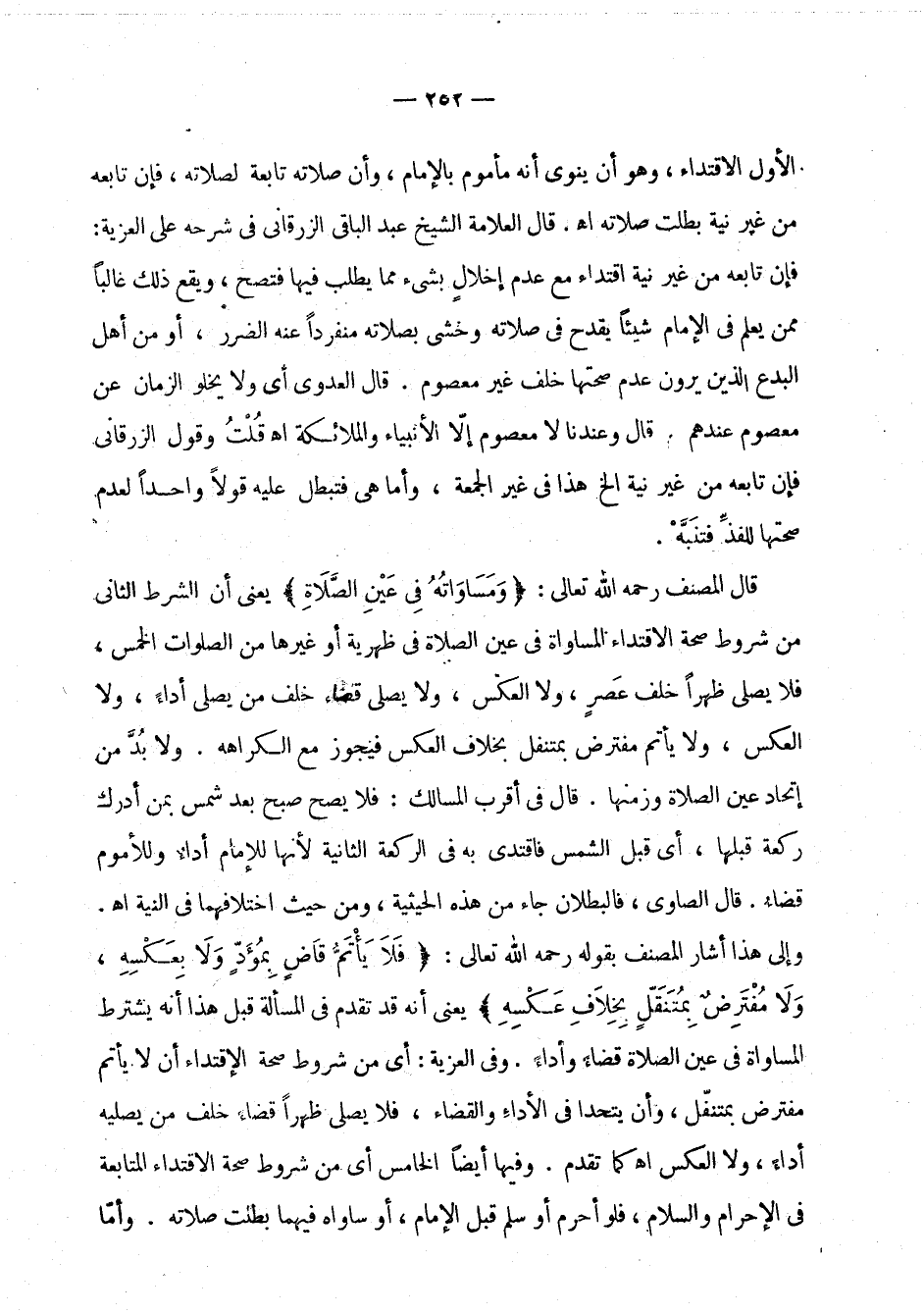 الأول الاقتداء، وهو أن ينوي أنه مأموم بالإمام، وأن صلاته تابعة لصلاته، فإن تابعه من غير نية بطلت صلاته اهـ. قال العلامة الشيخ عبد الباقي الزرقاني في شرحه على العزية: فإن تابعه من غير نية اقتداء مع عدم إخلال بشيء مما يطلب فيها فتصح، ويقع ذلك غالبا ممن يعلم في الإمام شيئا يقدح في صلاته وخشي بصلاته منفردا عنه الضرر، أو من أهل البدع الذين يرون