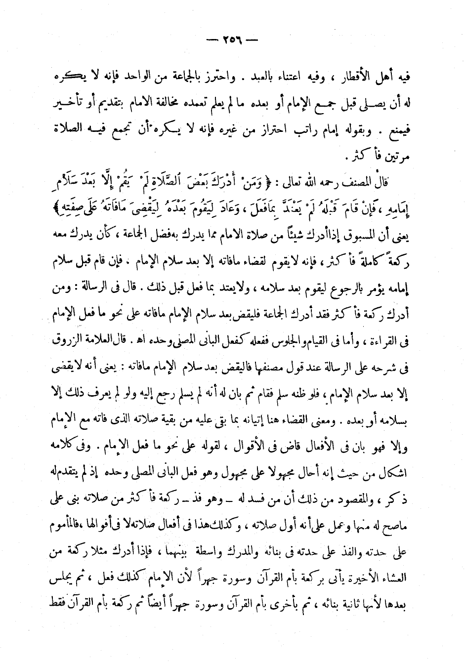 فعل قبل ذلك. قال في الرسالة: ومن أدرك ركعة فأكثر فقد أدرك الجماعة فليقض بعد سلام الإمام ما فاته على نحو ما فعل الإمام في القراءة، وأما في القيام والجلوس ففعله كفعل الباني المصلي وحده اهـ. قال العلامة الزروق في شرحه على الرسالة عند قول مصنفها فليقض بعد سلام الإمام ما فاته: يعني أنه لا يقضي إلا بعد سلام الإمام، فلو ظنه سلم فقال ثم بان له أنه لم يسلم رجع إليه ولو لم يعرف ذلك إلا بسلامه أو بعده. ومعنى القضاء هنا إتيانه بما بقي عليه من بقية صلاته التي فاتته مع الإمام وإلا فهو بان في الأفعال قاض في الأقوال، لقوله على نحو ما فعل الإمام. وفي كلامه إشكال من حيث إنه أحال مجهولا على مجهول وهو فعل الباني المصلي وحده إذ لم يتقدم له ذكر، والمقصود من ذلك أن من فسد له - وهو فذ - ركعة فأكثر من صلاته بنى على ما صح له منها وعمل على أنه أول صلاته، وكذلك هذا في أفعال صلاته لا في أقوالها، فالمأموم على حدته في بنائه والمدرك واسطة بينهما، فإذا أدرك مثلا ركعة من العشاء الأخيرة يأتي بركعة بأم القرآن وسورة جهرا لأن الإمام كذلك فعل، ثم يجلس بعدها لأنها ثانية بنائه، ثم بأخرى بأم القرآن وسورة جهرا أيضا ثم ركعة بأم القرآن فقط