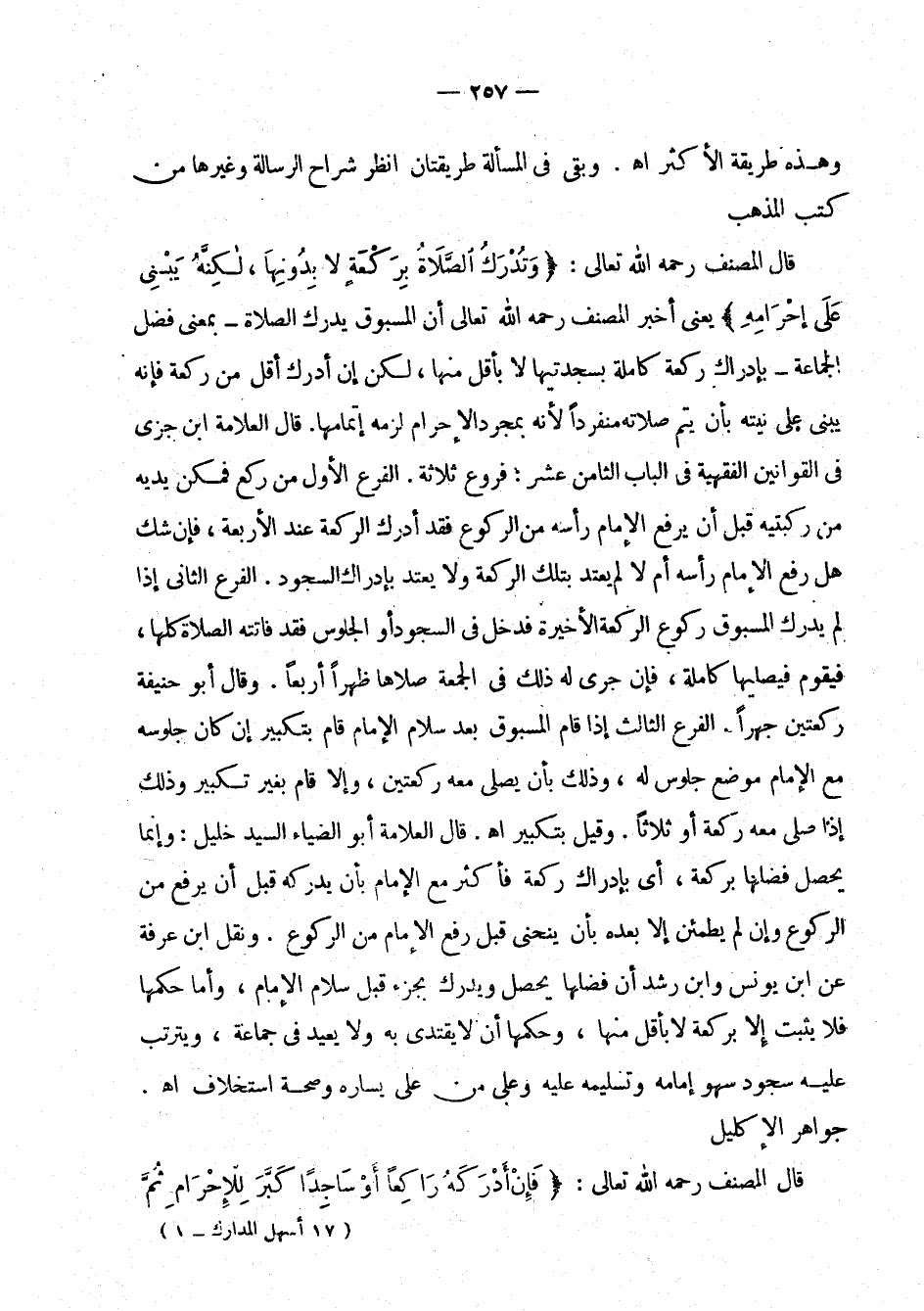 قال المصنف رحمه الله تعالى: " وتدرك الصلاة ركعة لا بدونها، لكنه يبني على إحرامه " يعني أخبر المصنف رحمه الله تعالى أن المسبوق يدرك الصلاة - بمعنى فضل الجماعة - بإدراك ركعة كاملة بسجدتيها لا بأقل منها، لكن إن أدرك أقل من ركعة فإنه يبني على نيته بأن يتم صلاته منفردا لأنه بمجرد الإحرام لزمه إتمامها. قال العلامة ابن جزي في القوانين الفقهية في الباب الثامن عشر: فروع ثلاثة: الفرع الأول: من ركع فمكن يديه من ركبتيه قبل أن يرفع الإمام رأسه من الركوع فقد أدرك الركعة عند الأربعة، فإن شك هل رفع الإمام رأسه أم لا لم يعتد بتلك الركعة ولا يعتد بإدراك السجود. الفرع الثاني: إذا لم يدرك المسبوق ركوع الركعة الأخيرة فدخل في السجود أو الجلوس فقد فاتته الصلاة كلها، فيقوم فيصليها كاملة، فإن جرى له ذلك في الجمعة صلاها ظهرا أربعا. وقال أبو حنيفة ركعتين جهرا. الفرع الثالث: إذا قام المسبوق بعد سلام الإمام قام بتكبير إن كان جلوسه مع الإمام موضع جلوس له، وذلك بأن يصلي معه ركعتين، وإلا قام بغير تكبير وذلك إذا صلى معه ركعة أو ثلاثا. وقيل بتكبير اهـ. قال العلامة أبو الضياء السيد خليل: وإنما يحصل فضلها بركعة، أي بإدراك ركعة فأكثر مع الإمام بأن يدركه قبل أن يرفع من الركوع وإن لم يطمئن إلا بعده بأن ينحني قبل رفع الإمام من الركوع. ونقل ابن عرفة عن ابن يونس وابن رشد أن فضلها يحصل ويدرك