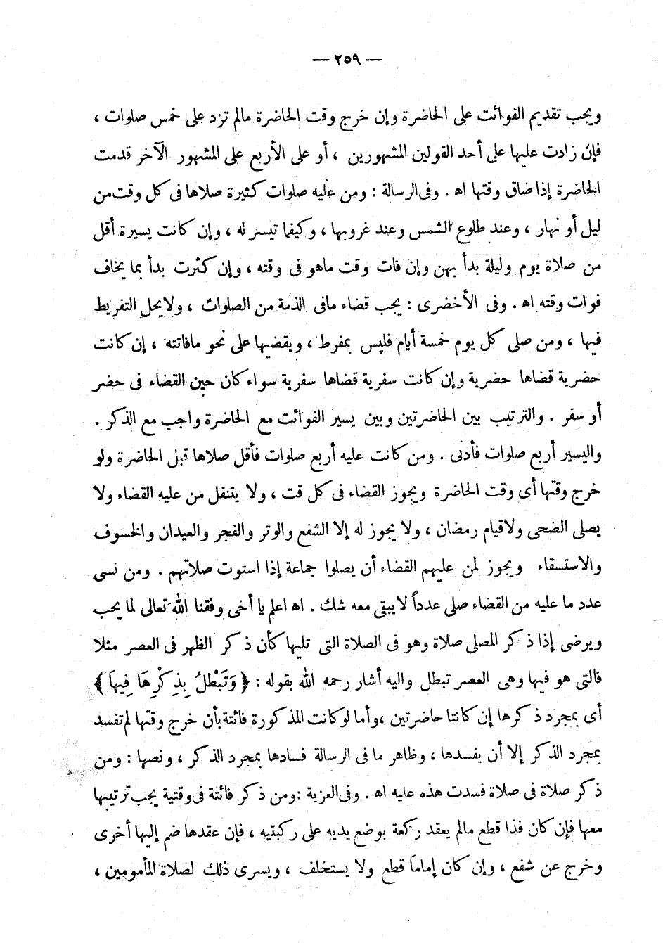 إذا ضاق وقتها اهـ. وفي الرسالة: ومن عليه صلوات كثيرة صلاها في كل وقت من ليل أو نهار، وعند طلوع الشمس وعند غروبها، وكيفما تيسر له، وإن كانت يسيرة أقل من صلاة يوم وليلة بدأ بهن وإن فات وقت ما هو في وقته، وإن كثرت بدأ بما يخاف فوات وقته اهـ. وفي الأخضري: يجب قضاء ما في الذمة من الصلوات، ولا يحل التفريط فيها، ومن صلى كل يوم خمسة أيام فليس بمفرط، ويقضيها على نحو ما فاتته، إن كانت حضرية قضاها حضرية وإن كانت سفرية قضاها سفرية سواء كان حين القضاء في حضر أو سفر. والترتيب بين الحاضرتين وبين يسير الفوائت مع الحاضرة واجب مع الذكر. واليسير أربع صلوات فأدنى. ومن كانت عليه أربع صلوات فأقل صلاها قبل الحاضرة ولو خرج وقتها أي وقت الحاضرة ويجوز القضاء في كل وقت، ولا يتنفل من عليه القضاء ولا يصلي الضحى ولا قيام رمضان، ولا يجوز له إلا الشفع والوتر والفجر والعيدان والخسوف والاستسقاء ويجوز لمن عليهم القضاء أن يصلوا جماعة إذا استوت صلاتهم. ومن نسي عدد ما عليه من القضاء صلى عددا لا يبقى معه شك. اهـ