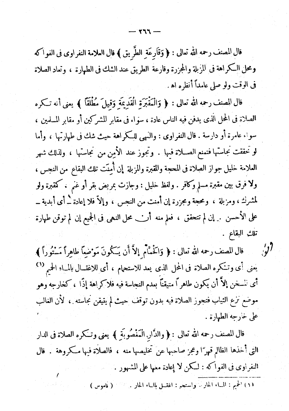 قال المصنف رحمه الله تعالى: " والحمام إلا أن يكون موضعا طاهرا مستورا " يعني أي وتكره الصلاة في المحل الذي يعد للاستحمام، أي للاغتسال بالماء الحميم (¬1) أي المسخن إلا أن يكون طاهرا متيقنا بعدم النجاسة فيه فلا كراهة إذا، كخارجه وهو موضع نزع الثياب فتجوز الصلاة فيه بدون توقف حيث لم يتيقن نجاسته، لأن الغالب على خارجه الطهارة.