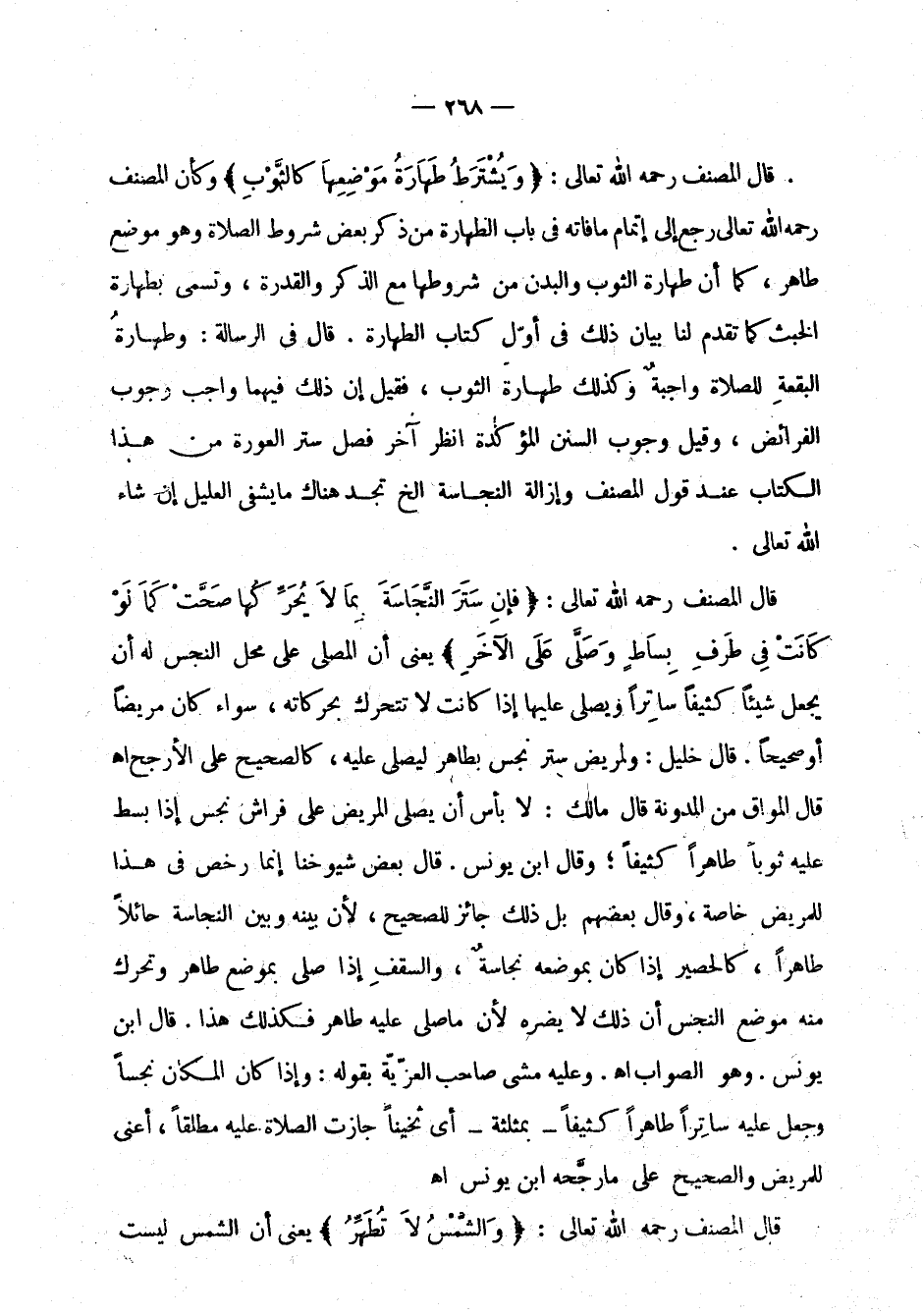 قال المصنف رحمه الله تعالى: " ويشترط طهارة موضعها كالثوب " وكأن المصنف رحمه الله تعالى رجع إلى إتمام ما فاته في باب الطهارة من ذكر بعض شروط الصلاة وهو موضع طاهر، كما أن طهارة الثوب والبدن من شروطها مع الذكر والقدرة، وتسمى بطهارة الخبث كما تقدم لنا بيان ذلك في أول كتاب الطهارة. قال في الرسالة: وطهارة البقعة للصلاة واجبة وكذلك طهارة الثوب، فقيل إن ذلك فيهما واجب وجوب الفرائض، وقيل وجوب السنن المؤكدة انظر آخر فصل ستر العورة من هذا الكتاب عند قول المصنف وإزالة النجاسة إلخ تجد هناك ما يشفي العليل إن شاء الله تعالى.