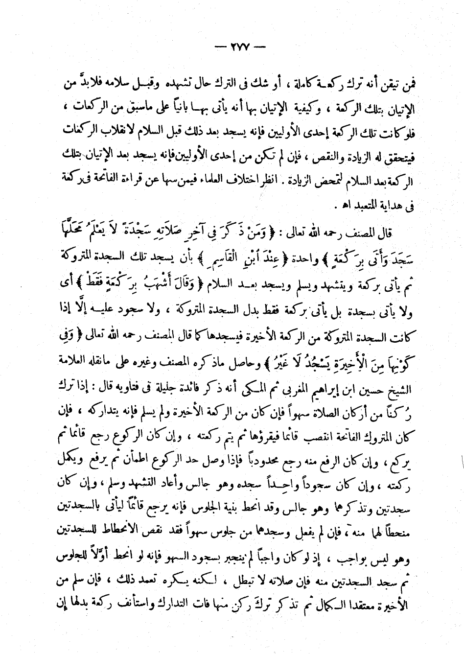 قال المصنف رحمه الله تعالى: " ومن ذكر في آخر صلاته سجدة لا يعلم محلها سجد وأتى بركعة " واحدة " عند ابن القاسم " بأن يسجد تلك السجدة المتروكة ثم يأتي بركعة ويتشهد ويسلم ويسجد بعد السلام " وقال أشهب بركعة فقط " أي إذا كانت السجدة المتروكة من الركعة الأخيرة فيسجدها كما قال المصنف رحمه الله تعالى: " وفي كونها من الأخيرة يسجد لا غير " وحاصل ما ذكره المصنف وغيره على ما نقله العلامة الشيخ حسين بن إبراهيم المغربي ثم المكي أنه ذكر فائدة جليلة في فتاويه قال: إذا ترك ركنا من أركان الصلاة سهوا فإن كان من الركعة الأخيرة ولم يسلم فإنه يتداركه، فإن كان المتروك الفاتحة انتصب قائما فيقرؤها ثم يتم ركته، وإن كان الركوع رجع قائما ثم يركع، وإن كان الرفع منه رجع محدودبا فإذا وصل حد الركوع اطمأن ثم يرفع ويكمل ركعته، وإن كان سجودا واحدا سجده وهو جالس وأعاد التشهد وسلم، وإن كان سجدتين وتذكرهما وهو جالس وقد انحط بنية الجلوس فإنه يرجع قائما ليأتي بالسجدتين منحطا لهما منه، فإن لم يفعل وسجدهما من جلوس سهوا فقد نقص الانحطاط للسجدتين وهو ليس بواجب، إذ لو كان واجبا لم ينجبر بسجود السهو فإنه لو انحط أولا للجلوس