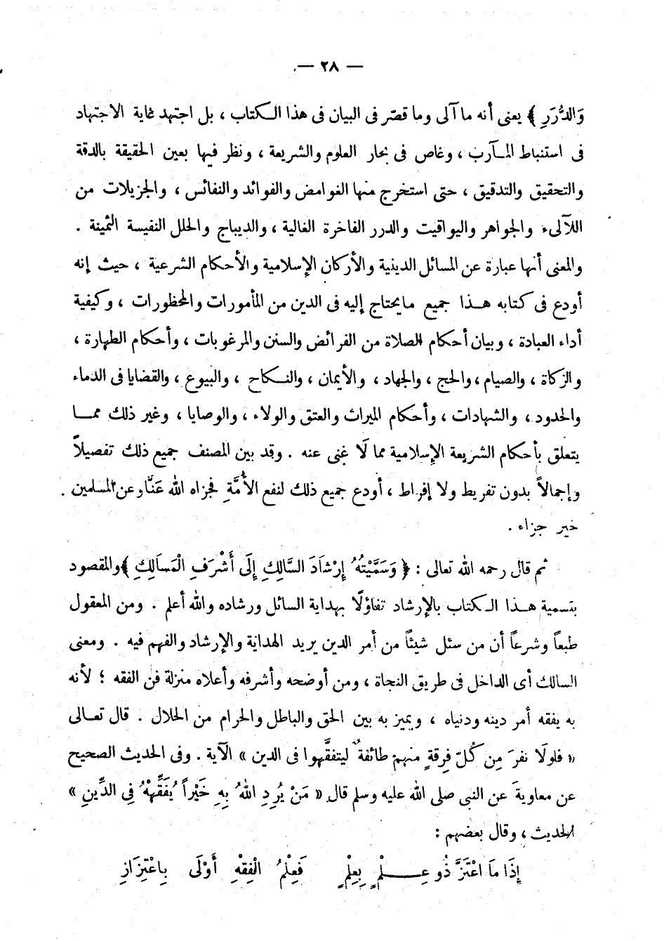 ومن المعقول طبعا وشرعا أن من سئل شيئا من أمر الدين يريد الهداية والإرشاد والفهم فيه. ومعنى السالك أي الداخل في طريق النجاة، ومن أوضحه وأشرفه وأعلاه منزلة فن الفقه؛ لأنه به يفقه أمر دينه ودنياه، ويميز به بين الحق والباطل والحرام من الحلال. قال تعالى: {فَلَوْلاَ نَفَرَ مِن كُلِّ فِرْقَةٍ مِّنْهُمْ طَآئِفَةٌ لِّيَتَفَقَّهُواْ فِي الدِّينِ} [التوبة: 122] الآية.