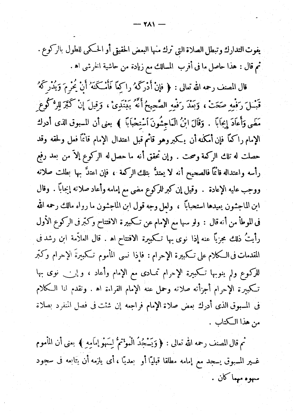 ثم قال: هذا حاصل ما في أقرب المسالك مع زيادة من حاشية الخرشي اهـ.