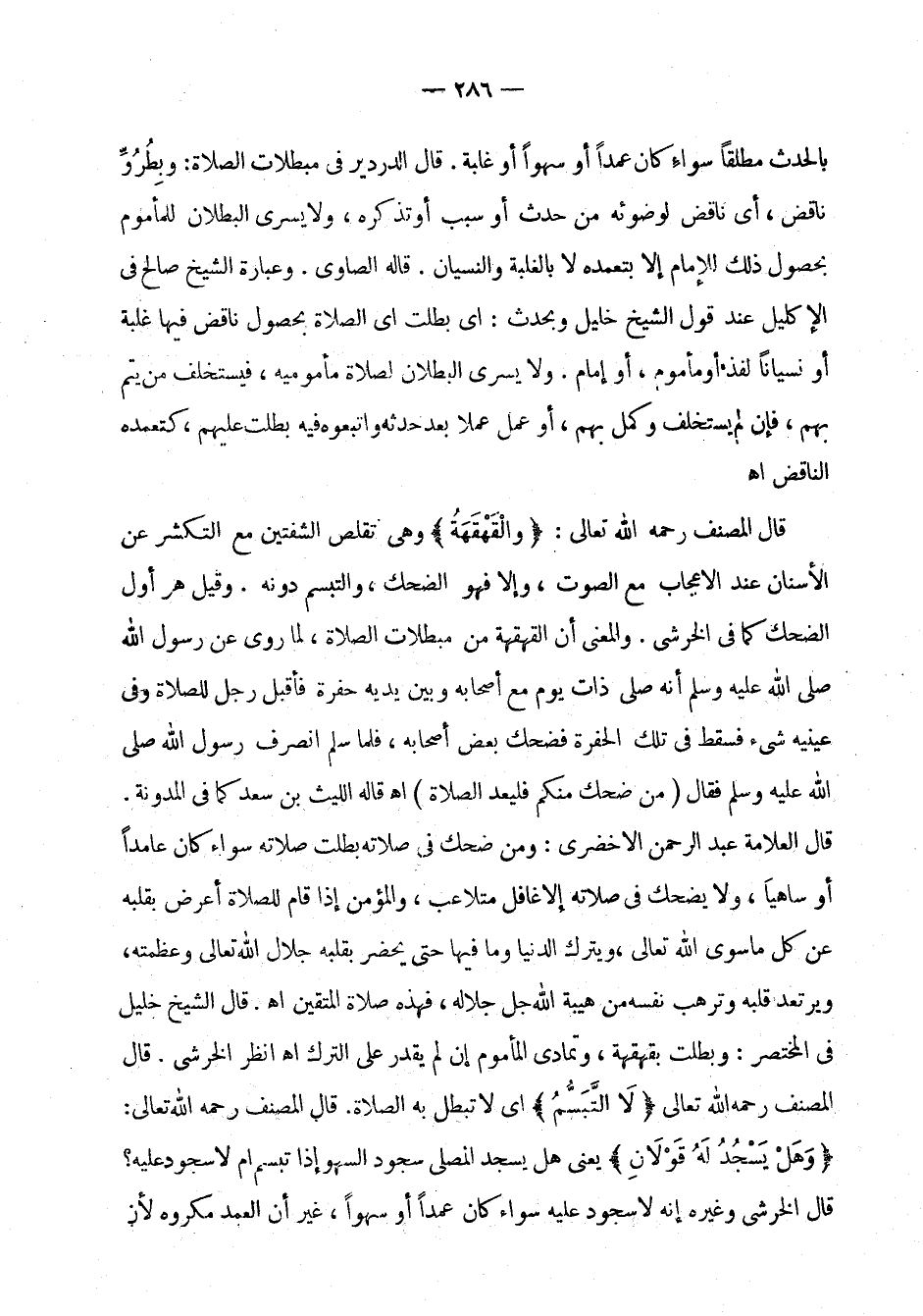 قال المصنف رحمه الله تعالى: " والقهقهة " وهي تقلص الشفتين مع التكشر عن الأسنان عند الإعجاب مع الصوت، وإلا فهو الضحك، والتبسم دونه. وقيل هو أول الضحك كما في الخرشي. والمعنى أن القهقهة من مبطلات الصلاة، لما روي عن رسول الله صلى الله عليه وسلم أنه صلى ذات يوم مع أصحابه وبين يديه حفرة فأقبل رجل للصلاة وفي عينيه شيء فسقط في تلك الحفرة فضحك بعض أصحابه، فلما سلم انصرف رسول الله صلى الله عليه وسلم فقال: " من ضحك منكم فليعد الصلاة " اهـ قاله الليث بن سعد كما في المدونة. قال العلامة عبد الرحمن الأخضري: ومن ضحك في صلاته بطلت صلاته سواء كان عامدا أو ساهيا، ولا يضحك في صلاته إلا غافل متلاعب، والمؤمن إذا قام للصلاة أعرض بقلبه عن كل ما سوى الله تعالى، ويترك الدنيا وما فيها حتى يحضر بقلبه جلال الله تعالى وعظمته، ويرتعد قلبه وترهب نفسه من هيبة الله جل جلاله، فهذه صلاة المتقين اهـ. قال الشيخ خليل في المختصر: وبطلت بقهقهة، وتمادى المأموم إن لم يقدر على الترك اهـ انظر الخرشي. قال المصنف رحمه الله تعالى: " لا التبسم " أي لا تبطل به الصلاة. قال المصنف رحمه الله تعالى: " وهل يسجد له قولان " يعني هل يسجد المصلي سجود السهو إذا تبسم أم لا سجود عليه؟ قال الخرشي وغيره إنه لا سجود عليه سواء كان
